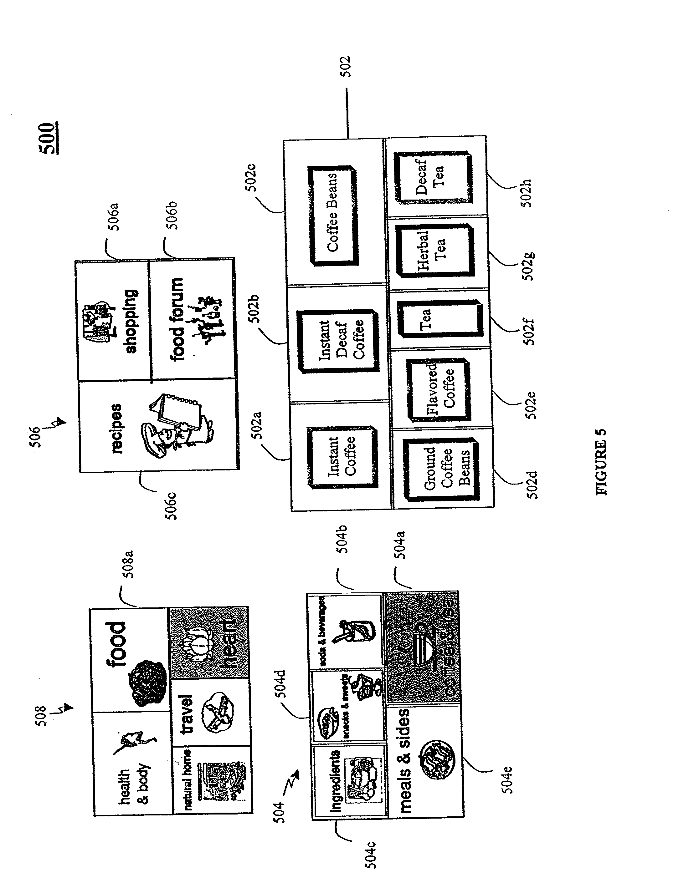 [0108] As mentioned above, to create the exemplary structure, the illustrative extractor module 102 uses the mapping module 116. Operation of the mapping module 116 depends on the type of content received by the extractor module 102. For example, for a file structure, the mapping module 116 traverses the directory tree until it creates a node for each file (i.e., data object) and each directory (i.e., data object) and creates the appropriate parent-child relationship between the nodes (i.e., data objects). [0109] In other databases, there are no hierarchical relationships between data objects. In that case, the mapping module 116 creates them. In other databases, such as for example, a flat list of names and personal information, the hierarchical structure may be less evident. In that case, the mapping module 116, preferably, creates the relationships using some predetermined priorities (e.g., parent nodes are state of residence first, then letters of the alphabet). [0110] If the content is Web-related content, the mapping module 116 extracts the vital information by first determining the flow or order of the Web site. To zoom enable a typical Web site, the mapping module 116 extracts from the Web site a data hierarchy. HTML pages are a mix of data and formatting instructions for that data. HTML pages also include links to data, which may be on the same page or a different page. In one embodiment, the mapping module 116 “crawls” a Web site and identifies a “home” data node (for example, on the home page) and the name of the company or service. Next, the mapping module 116 identifies the primary components of the service such as, for example, a table of contents, along with the main features such as “order,” “contact us,” “registration,” “about us,” and the like. Then the mapping module 116 recursively works through the sub-sections and sub-subsections, until it reaches “leaf nodes” which are products, services, or nuggets of information (i.e., ends of the node tree branches). [0111] This process determines critical data and pathways, stripping away non-essential data and creating a hierarchical tree to bind the primary content. This stripping down creates a framework suitable for zooming, provides the user with a more meaningful focused experience, and reduces strain on the client/server connection bandwidth. [0112] [0113] In another embodiment, the extractor module 102 extracts each displayable element from a Web page. Each element becomes a data object. The mapping module 116, preferably, creates a hierarchical relationship between the data objects based on the value of the font size of the element. The mapping module 116 positions those data objects (e.g., HTML elements) with a larger value font size higher in the hierarchical relationship than those data objects with a smaller value font size. Additionally, the mapping module 116, preferably, uses the location of each element in the Web page as a factor in creating the hierarchical relationship. More particularly, the mapping module 116 locates those elements that are next to each other on the Web page, near each other in the hierarchical relationship. [0114] In another embodiment, to further help extract the vital information from Web sites, the mapping module 116 uses techniques such as traversing the hyperlinks, the site index, the most popular paths traveled and/or the site toolbar, and parsing the URL. [0115] Additionally, the mapping module 116 can parse the URL to obtain information about the Web site. Typically, URLs are in the form http://www.name.com/dir1/dir2/file.html. The name.com field generally indicates the name of the organization and the type of the organization (.com company, .cr for Costa Rica, .edu for education and the like). The dir1 and dir2 fields provide hierarchical information. The file.html field can also reveal some information, if the file name is descriptive in nature, about the contents of the file. [0116] The mapping module 116 can also access information from Web sites that track the popularity of URL paths traveled. Such sites track which links and pages are visited most often, and weights paths based on the number of times they are traversed. The illustrative mapping module 116 uses the information obtained from such sites, alone or in combination with other relationship information gained with other techniques, to create the hierarchical relationships between extracted data objects. [0117] Once the mapping module 116, working in conjunction with the extractor module 102, creates a hierarchical data structure for the extracted data objects, the extractor module 102 processes the data objects of the content in terms of their relationship in the hierarchy. In one embodiment, a W3C standard language data structure (e.g., XML) is used to create a platform and vendor independent data warehouse, so that the rest of the system 100 can read the source content and relate the data objects of the content in virtual space 110. [0118] The types of transactions processed by the extractor module 102 are transactions relating to obtaining the hierarchical relationships between data objects. For example, for node information, a representative input can be “get node[x]” and the corresponding output is the requested node[x] itself. For data information, a representative input can be “get data” and the corresponding output is the requested data itself. For parent information, a representative input can be “get parent” and the corresponding output is the requested parent itself. For child information, a representative input can be “get child[x]” and the corresponding output is the requested child[x] itself. The extractor module 102 provides the output (i.e., the XML data structure) to the stylizer module 104. [0119] As mentioned briefly above, the stylizer module 104 converts the data objects from the extractor module 102 into ZML™ format. The stylizer module uses one or m