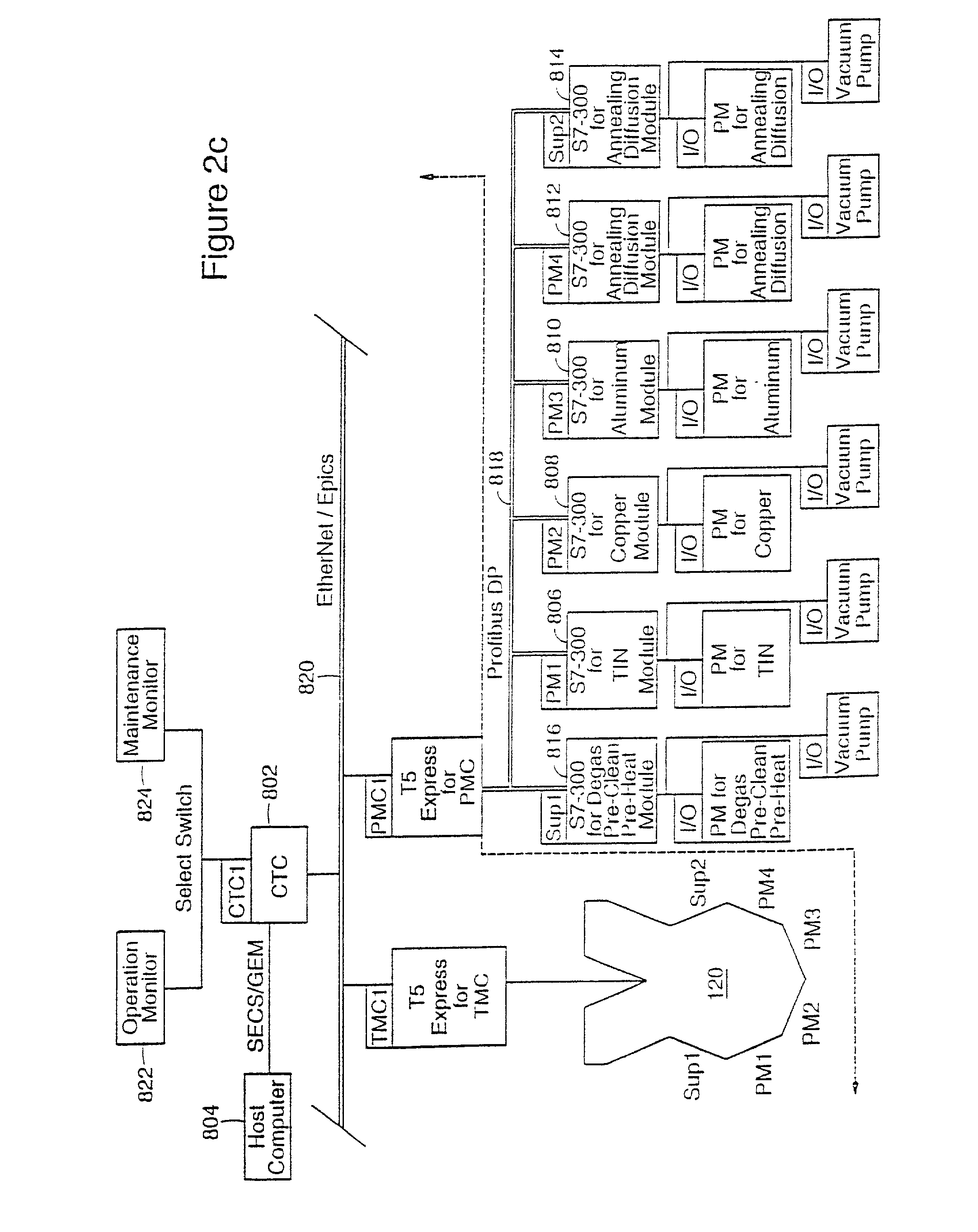 [0201]FIG. 17 illustrates an alternative configuration for a factory automated CVD processing system. In FIG. 17, the individual components (i.e., CVD apparatus 10, preheat modules 130, cooling modules 132, transport modules 122) of each cluster tool 120a and 120b are controlled by separate cluster tool controllers 705a and 705b. Factory automation controller 702 controls each cluster tool controller 705a and 705b, and can control wafer handoff mechanism 701.