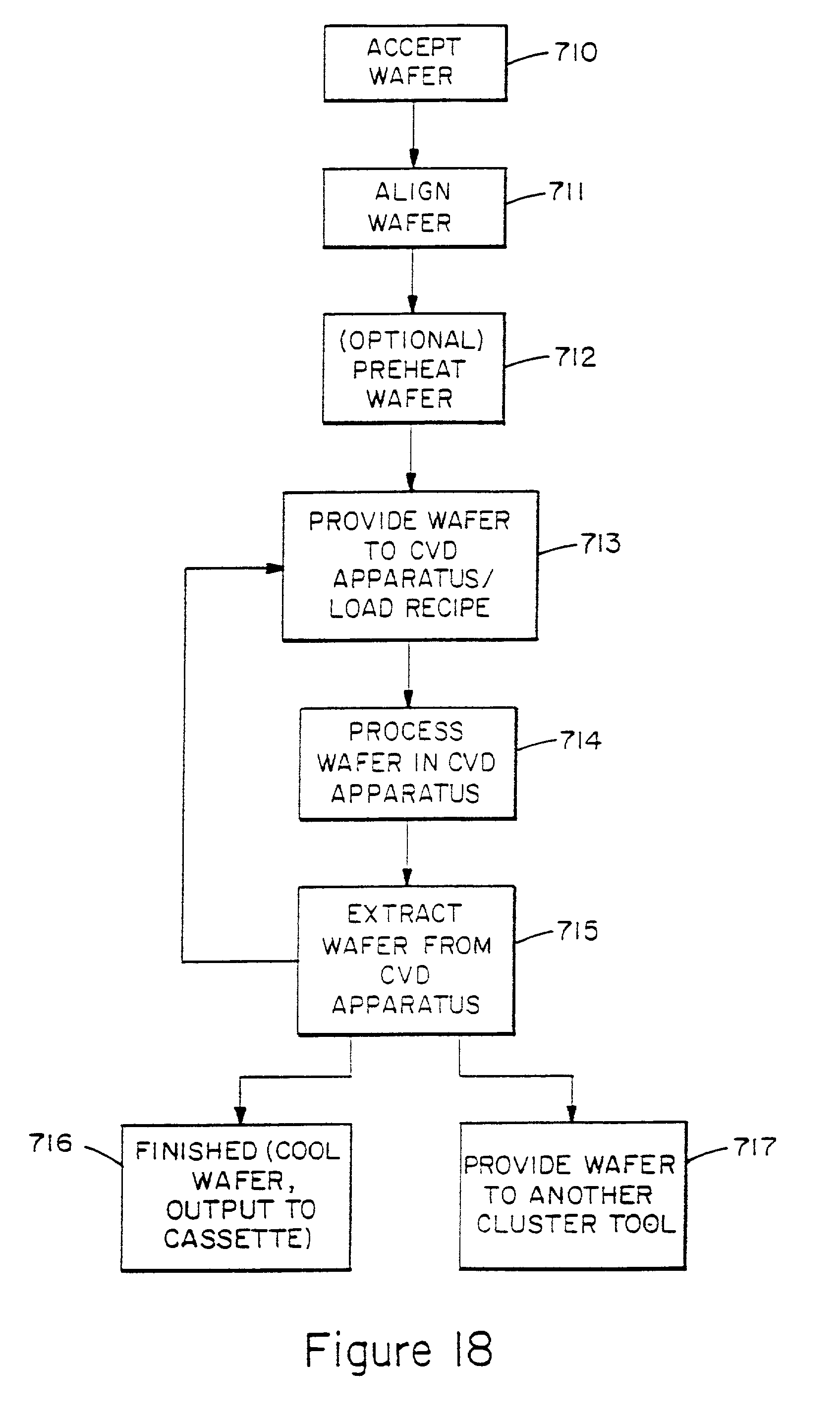 [0206] Once the wafer is correctly oriented, in step 712, which is an optional step, the wafer may be pre-heated in pre-heat module 130. Heating the wafer brings the wafer up to a temperature at or near the operating or substrate chuck temperature of the first CVD apparatus 10 that will accept the wafer. Next, the robotic arm 134, in step 713, places the wafer into one of the CVD apparatus 10a-c of the current cluster tool controller 120a for CVD processing in step 714, as explained above. While three CVD apparatus 9a through 10c are illustrated in FIG. 16, the invention is not limited to three, and there may be one, two, three or many more such system all accessible by a single robotic arm 134. After the wafer has completed CVD processing in step 714 in CVD apparatus 9a, in step 715, the robotic arm extracts the wafer. Next, the wafer either moves to the next CVD apparatus (i.e., back to step 713), or finishes processing (step 716) by being cooled in cool module 132 and exiting the cluster tool 12a via output cassette 140, or the wafer is passed to another cluster tool 120b via wafer handoff mechanism 701 (step 717). Generally, wafer processing repeats until the correct sequence of heating, CVD processing and cooling has been performed, as dictated by the wafer processing program executing in cluster tool controller 705a controlling the operation of cluster tool 120a.