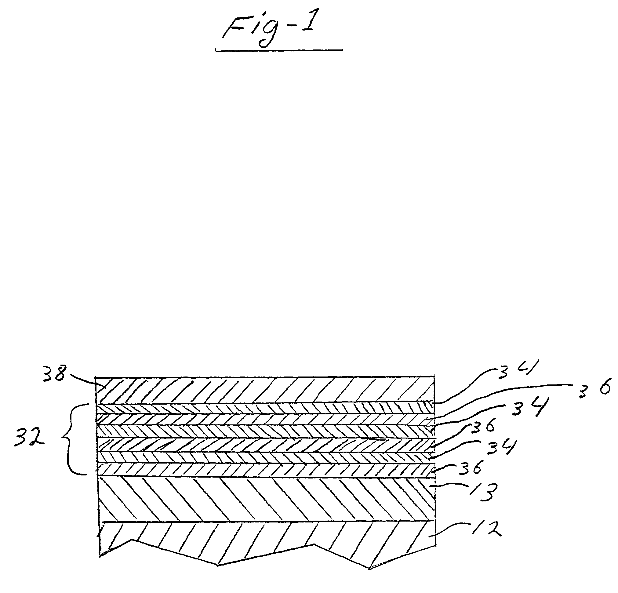 [0041] In one embodiment disposed intermediate stack layer 32 and the polymeric basecoat layer 13 is a chromium metal, a refractory metal or refractory metal alloy layer 31. The chromium metal, refractory metal layer or refractory metal alloy layer 31 generally functions, inter alia, as a strike layer which improves the adhesion of the stack layer 32 to the polymeric layer. As illustrated in FIGS. 2 and 3, the chromium metal, refractory metal or refractory metal alloy strike layer 31 is generally disposed intermediate the stack layer 32 and the polymeric layer 13. Layer 31 has a thickness which is generally at least effective for layer 31 to function as a strike layer, i.e., improve the adhesion of the stack layer 32 to the polymeric layer 13. Generally, this thickness is at least about 60 Å, preferably at least about 127 Å, and more preferably at least about 250 Å. The upper thickness range is not critical and is generally dependent upon considerations such as cost. Generally, however, layer 31 should not be thicker than about 1.25 um, preferably about 0.40 um, and more preferably about 0.25 um.
