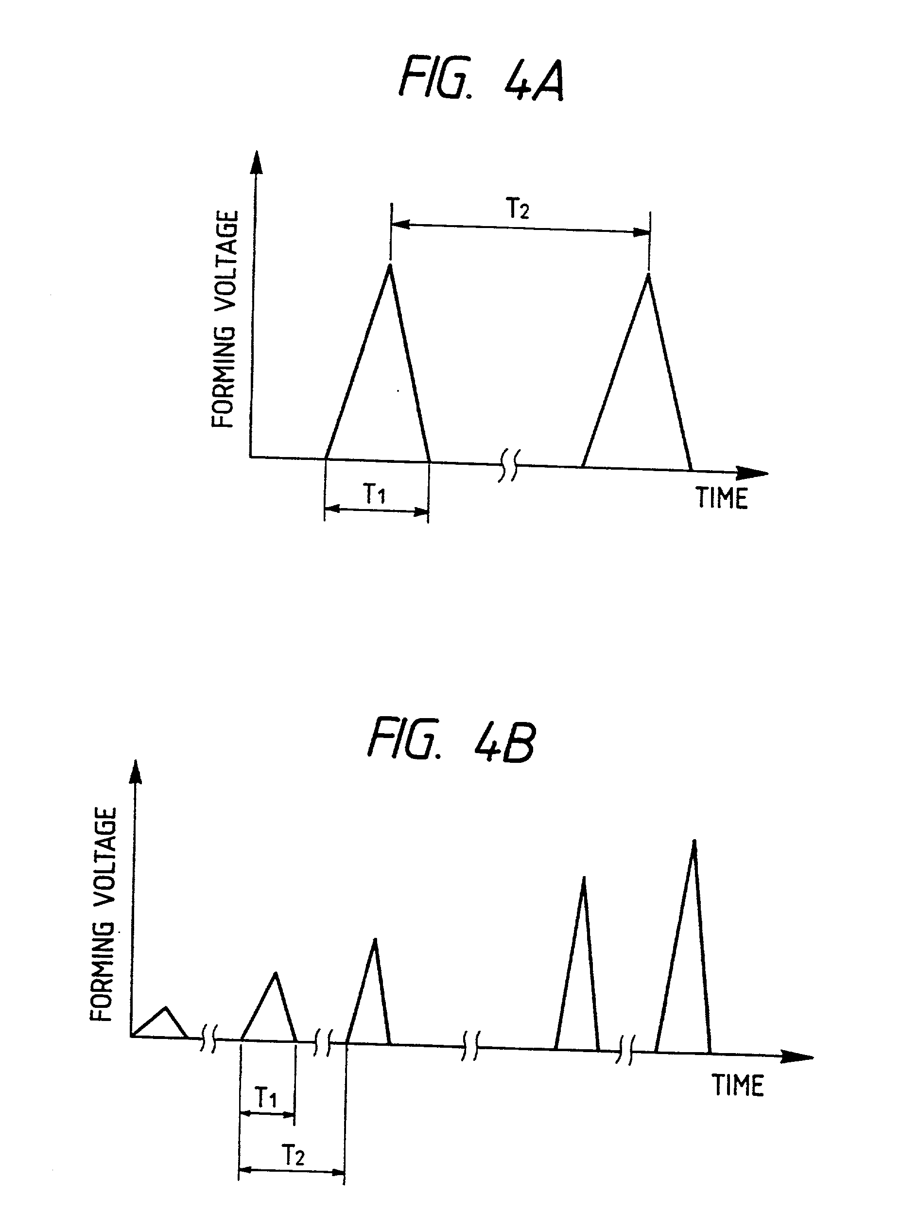[0001] 1. Field of the Invention [0002] The present invention relates to an electron-emitting device, and also to an electron source substrate, an electron source, a display panel and an image-forming apparatus, using the electron-emitting device. The present invention also relates to methods of producing these devices and apparatus. [0003] 2. Related Background Art [0004] In the art of electron-emitting devices, two types are known, one is a thermionic emission source and the other is a cold-cathode emission source. Cold-cathode emission source types include a field emission type (hereafter referred to as an FE type), metal/insulator/metal type (hereafter referred to as an MIM type), and a surface conduction type electron-emitting device. [0005] Examples of FE types are disclosed for example in “Field Emission” (W. P. Dyke and W. W. Dolan, Advance in Blectron Physics. 8, 89(1956)) and “Physical Properties of Thin-Film Field Emission Cathodes with Molybdenum Cones” (C. A. Spindt, J. Appl. Phys., 47, 5248(1976)). [0006] An example of an MIM type has been reported by C. M. Mead (J. Appl. Phys., 32,646 (1961)). [0007] An example of a surface conduction type electron-emitting device has been reported by M. I. Elinson (Radio Eng. Electron Phys., 10 (1965)). [0008] Surface conduction type electron-emitting devices use a phenomenon that electron emission occurs when a current is passed through a thin film with a small area formed on a substrate in a direction parallel to the film surface. Various types of surface conduction electron-emitting devices are known. They include a device using a thin SnO2film proposed by Elinson et. al., a device using a thin Au film (G. Dittmer, Thin Solid Films, 9, 317 (1972)), a device using a thin In2O3/SnO2film (M. Hartwell and C. G. Fonstad, IEEE Trans. ED Conf., 519 (1975)), and a device using a thin carbon film (Araki et. al., Vacuum, 26(1), 22 (1983)). [0009] The device proposed by Hartwell is taken here as a representative example of a surface conduction type electron-emitting device, wherein its structure is shown in [0010] In conventional surface conduction type electron-emitting devices, before using the devices to emit electrons, the electrically-conductive thin film 4 is subjected to an energization forming process thereby forming an electron emission region 5. In this energization forming, a DC voltage or a voltage which rises at a very slow rate for example 1 V/min is applied across the electrically-conductive thin film 4 so that the electrically-conductive thin film is locally broken, deformed, or changed in quality, thereby forming an electron emission region 5 having a high electric resistance. In the electron emission region 5, cracks are partially formed in the electrically-conductive thin film 4 and electrons are emitted via the cracks or via regions near the cracks. After completion of the forming process, a voltage is applied across the electrically-conductive thin film 4 so that a current flows through the electrically-conductive thin film 4 thereby emitting an electron from the electron emission region 5. [0011] The electron-emitting device of the surface conduction type has a simple structure and thus can be easily produced. Therefore, it is possible to dispose a great number of similar devices over a large area. To take such advantages in practical applications such as an electron beam source, a display device or an image display device, etc., extensive research and development is being done. [0012] The inventors of the present invention have investigated the electron-emitting device of the surface conduction type and have proposed a new method of producing an electron-emitting device in Japanese Patent Application Laid-Open No. 2-56822 (1990). [0013] However, in the conventional production method described above, it is based on the semiconductor process and thus it is difficult to form a large number of electron-emitting devices over a large area. Besides, this technique needs a special and expensive production apparatus. Furthermore, the above patterning process requires a plurality of long steps. At present, therefore, high cost is required to form a great number of electron-emitting devices over a large area of a substrate. Thus there is a need for a simplified patterning technique. [0014] It is an object of the present invention to solve the above problems. More particularly, it is an object of the present invention to provide a method of producing an electron-emitting device, capable of forming a large number of electron-emitting devices on a substrate at a low cost. It is another object of the present invention to provide an electron source substrate, an electron source, a display panel, and an image-forming apparatus using such an electron-emitting device. [0015] It is still another object of the present invention to provide a method of producing an electron-emitting device, in which patterning is performed with a simplified process. [0016] It is a further object of the present invention to provide a method of producing an electron-emitting device, capable of supplying a desired amount of conductive material at a desired location on a substrate, using a simplified production process. [0017] It is still another object of the present invention to provide an electron source substrate, an electron source, a display panel, and an image-forming apparatus using such an electron-emitting device. [0018] The above objects are achieved by the present invention having various aspects and features as described below. [0019] In a first aspect of the present invention, there is provided a method of producing an electron-emitting device including the steps of: forming a pair of electrodes and an electrically-conductive thin film on a substrate in such a manner that the pair of electrodes are in contact with the electrically-conductive thin film; and forming an electron emission region using the electrically-conductive thin film, the metho