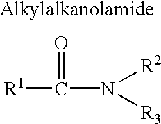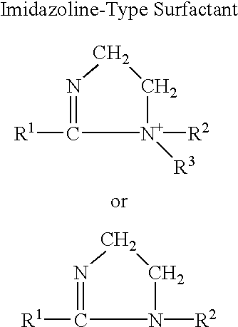 [0029] wherein [0030] R1: H or an alkyl or alkylphenol group having from 1 to 30, preferably from 10 to 20, carbon atoms; [0031] R2: a hydroxylalkyl group having from 1 to 30, preferably from 10 to 20, carbon atoms; and [0032] R3: CH2COO−/carboxylate group. [0033] The imidazoline-type surfactant includes the above two imidazolinium betaine-type amphoteric surfactants, imidazoline derivatives and the like (substances like amphoteric surfactant may show the properties of a weak base when mixed with an anionic surfactant such as phosphoric acid ester). [0034] Specific examples thereof include 2-lauryl-N-carboxymethyl N-hydroxyethyl imidazolium betaine such as ANHITOL 20Y (produced by Kao Corporation), quaternized alkylimidazoline such as SOFNON (produced by Toho Chemical Industrial Co., Ltd.), alkylimidazoline such as TEXNOL IL55 (produced by Nippon Nyukazai Co., Ltd.), and imidazoline derivatives such as SUFRIC #512 (produced by Itoh Oil Chemicals Co., Ltd.) and SOFNON SSK-15 and NC-75 (produced by Toho Chemical Industrial Co., Ltd.).