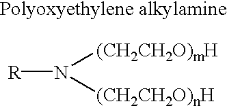 [0023] wherein [0024] n, m, p: each an average addition molar number (n, m, p≧0, preferably 10≧n, m≧0, p≧0) of ethylene oxide; and [0025] R; each independently an alkyl group or alkylphenol group having from 3 to 30, preferably from 10 to 20, carbon atoms. [0026] With respect to the alkyl group which can form the phosphoric acid ester structure, an alkyl group obtained from a naturally occurring or synthetic higher alcohol is introduced. Among these phosphoric acid esters, a phosphoric acid ester capable of dissolving in an organic solvent used and having an acid value (pE: 9.5) in the range from 90 to 600 is most preferred [0027] Specific examples thereof include Phosphanol series such as RE-410, LE-500, RE-610, LE-700, RM-410, LM-400, LF200, LF205, RP-710, LP-700, RS-410, LS-500, RD-510Y, RB-410, LB-400, RA-600, GB-520, RD-720, ML-200 and ML-220, produced by Toho Chemical Industrial Co., Ltd., and additionally include PRISURF series such as A212E, A210G, AL, A212C, A215C, A208B, A206S and A208F, produced by Dai-ichi Kogyo Seiyaku Co., Ltd. Also, similar phosphoric acid esters are available from Asahi Denka Kogyo K.K. and the like. [0028] The weakly cationic component for use in the present invention includes imidazoline-type activator, polyoxyethylene alkylamine, polyoxyethylene alkylamide and alkylalkanclamide, and is represented by the following formula: