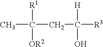 [0069] wherein R1, R2and R3each is independently H or CH3) are contained as a main solvent, a resin soluble in this mixed solvent is contained, and the ink viscosity is from 800 to 6,000 mpa·s at 25° C. (Japanese Patent Application No. 2000-105414). [0070] (3) A ballpoint pen oil-based ink composition, characterized in that one or more solvent having the following chemical structural formula: