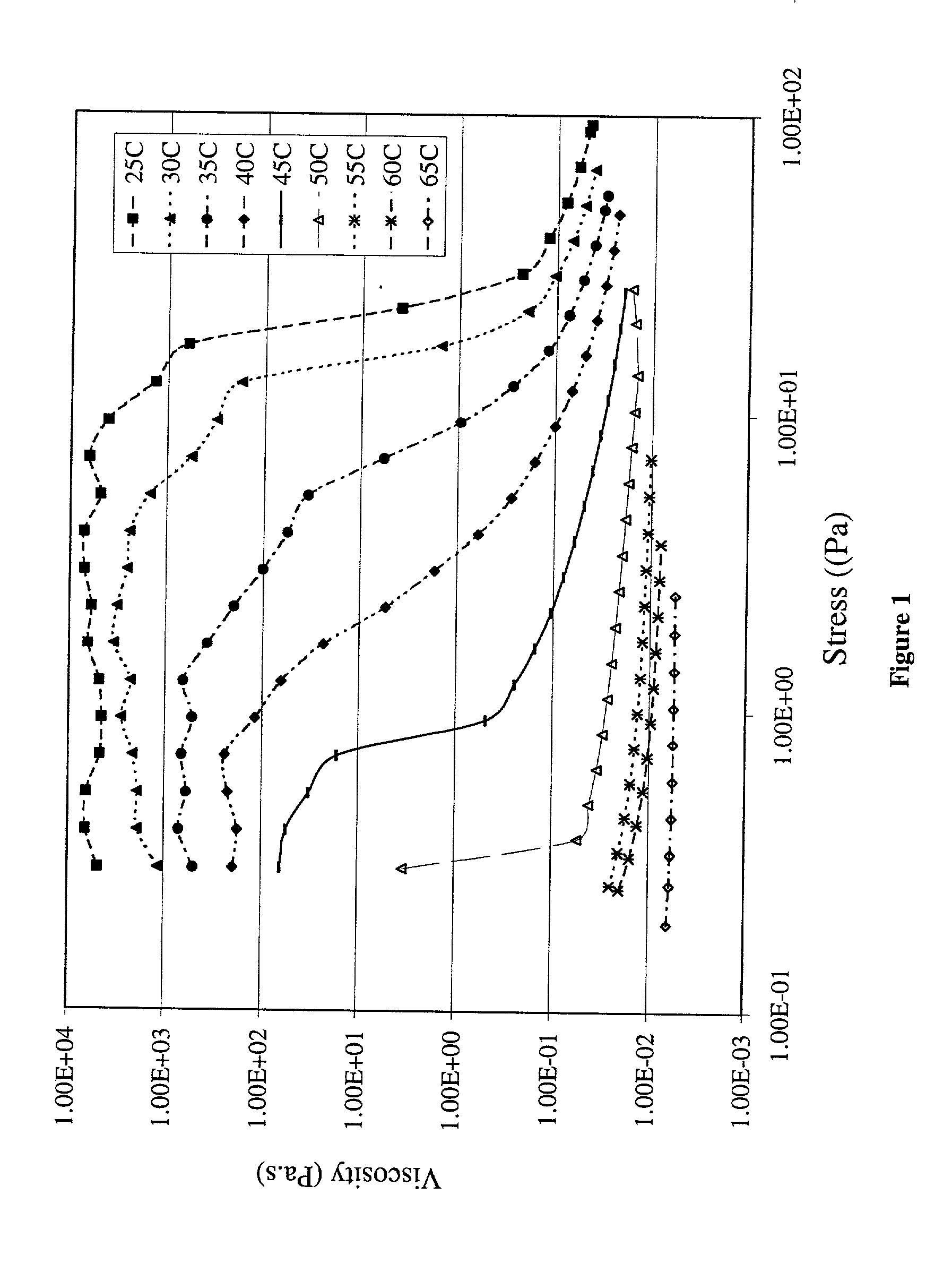 [0237] Table 7 shows the rheological behavior of various compositions as a function of temperature.