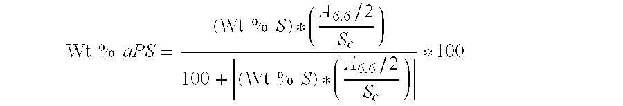 [0114] where: scand ecare styrene and ethylene proton fractions in the interpolymer, respectively, and Scand E are mole fractions of styrene monomer and ethylene monomer in the interpolymer, respectively. [0115] The weight percent of aPS in the interpolymers was then determined by the following equation: