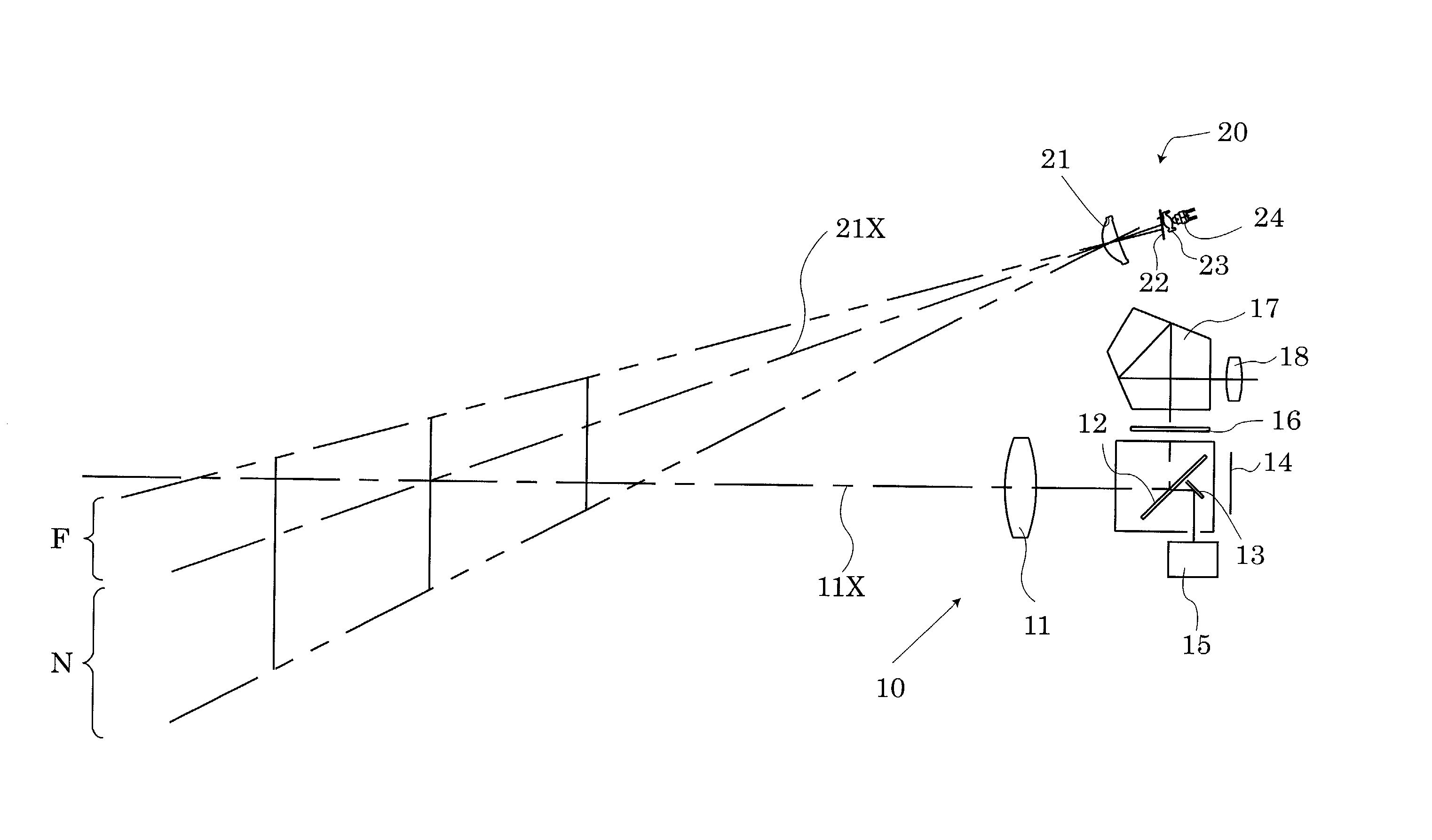 [0001] 1. Field of the Invention [0002] The present invention relates to an AF auxiliary light projector for a camera having an autofocus system. [0003] 2. Description of the Related Art [0004] Some SLR cameras and camcorders which incorporate a passive autofocus system are provided with an AF auxiliary light projector which emits an auxiliary light beam with a predetermined contrast pattern (e.g., a pattern of stripes) toward the object in low-light or low contrast situations to aid the autofocus system. It is desirable for the AF auxiliary light coverage to range from a near distance range to a far distance range. However, it is difficult to give a sufficient amount of AF auxiliary light to the object at a far distance since the light amount decreases as the AF auxiliary light projector is farther from the object. In AF cameras in which a distance measuring zone can be freely set within a photographing range and in AF cameras in which focus information is obtained from each of different distance measuring zones within a photographing range, the light projection area of the AF auxiliary light is desirably large. To increase the light projection area of the AF auxiliary light, it is conventionally the case that a large contrast pattern chart for forming the aforementioned predetermined contrast pattern is used, or that a contrast-pattern projecting lens having a short focal length is used. However, a large contrast pattern chart has to be illuminated if used for forming the predetermined contrast pattern, which leads to an increase in size of the illuminating lens system. In the case where a contrast-pattern projecting lens having a short focal length is used, the projection scaling factor of the contrast pattern increases to thereby decrease the amount of the AF auxiliary light projected onto the object, which inevitably decreases the performance of the AF system for far distance objects. [0005] The present invention has been devised in view of the problems noted above, and accordingly, the present invention provides a compact AF auxiliary light projector wherein the AF auxiliary light coverage ranges from a near distance range to a far distance range. [0006] For example, an AF auxiliary light projector for an AF camera is provided, including a focus detection optical system having a first optical axis, and an AF auxiliary light projecting optical system having a second optical axis which intersects the first optical axis, the AF auxiliary light projecting optical system projecting an image having a predetermined contrast pattern onto a photographic object. The AF auxiliary light projecting optical system includes a projector lens, a contrast pattern chart for forming the predetermined contrast pattern, an illumination lens, and an illumination light source, in that order from an intersection between the first optical axis and the second optical axis. The illumination lens is formed having an asymmetrical optical power so that an optical power of a far distance portion of the illumination lens for a far distance region in a projection region of the contrast pattern chart is greater than an optical power of a near distance portion of the illumination lens for a near distance region in the projection region of the contrast pattern chart. [0007] It is desirable for the illumination lens to be formed so as to satisfy the following condition: [0008] hN/hF>1.2; wherein “hN” designates a height of a first light ray from the second optical axis which is passed through the contrast pattern chart upon being emitted from the illumination light source to be incident on the near distance portion of the illumination lens at a first angle defined between the second optical axis and the first light ray; and “hF” designates a height of a second light ray from the second optical axis which is passed through the contrast pattern chart when the second light ray is emitted from the illumination light source to be incident on the far distance portion of the illumination lens at a second angle defined between the second optical axis and the second light ray, the absolute value of the second angle being the same as the absolute value of the first angle, and the angular orientation of the second angle being opposite to the angular orientation of the first angle. [0009] It is desirable for an angle of inclination of the second optical axis relative to the first optical axis and an angle of inclination of the contrast pattern chart relative to the second optical axis be determined so that a conjugate image of the contrast pattern chart is formed on a plane extending in a direction substantially parallel to the first optical axis. [0010] It is desirable for the focus detection optical system to be provided as a multi-zone focus detection optical system for obtaining focus information from each of a plurality of different detection zones. [0011] The illumination light source can be provided as a plurality of illumination light sources, and the illumination lens can be formed as a combination of a plurality of condenser lenses which condense light bundles emitted from the plurality of illumination light sources, respectively. [0012] In another embodiment, an AF auxiliary light projector for an AF camera is provided, including a focus detection optical system having a first optical axis, and an AF auxiliary light projecting optical system having a second optical axis which intersects the first optical axis, the AF auxiliary light projecting optical system projecting an image having a predetermined contrast pattern onto a photographic object. The AF auxiliary light projecting optical system includes a projector lens, a contrast pattern chart for forming the predetermined contrast pattern, an illumination lens, and an illumination light source, in that order from an intersection between the first optical axis and the second optical axis. At least one of front and rear surfaces of the illumination lens is decent