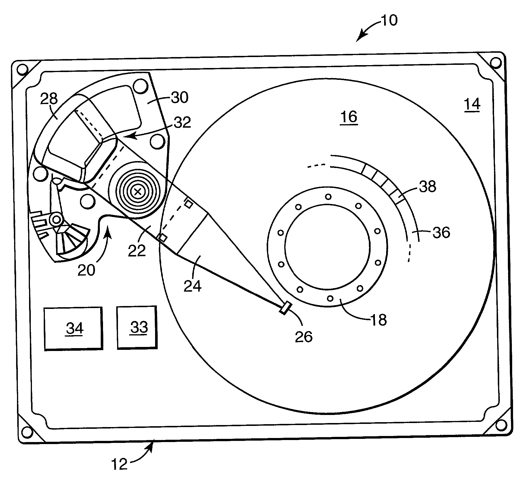 [0045] Where: [0046] TTV(h)=thermal transient variation for head h; [0047] N=total number of readback samples; [0048] M=number of samples in each window; [0049] TH=thermal signal; [0050] TTEA=thermal transient ensemble average. [0051] Of course, it is recognized that the disk drive 10 may include a number of separate transducer heads 52. With this in mind, rather than store individual thermal transient variation information for each of the heads, the system and method of the present invention preferably stores and/or tracks information for only those heads most exhibiting HDI deterioration. In this regard, it is recognized that in the early stages of a head crash, typically only one head is ultimately responsible. Effectively, this head is the weak link that will crash, and then propagate to the other heads. With this in mind, the thermal variation information stored by the programmable controller 34 can be a reflection of the head which has exhibited a thermal transient variance that is significantly different from the other heads in the same drive via a statistical test for outliers. Basically, the focus is upon detecting one or possibly two heads in a drive that have a significantly different thermal baseline signal variance, and then designating that as the thermal transient variance information (TTV(h)) for the disk drive 10. This outliers statistic (?) can be calculated as follows: ?=max(max( [0052] Pursuant to the above equation, the mean thermal transient variance number is calculated for each head and the maximum (max) and minimum (min) values are identified. The absolute difference between the minimum and the mean, and the difference between the maximum and the mean, are calculated. The larger of these two values is then divided by the determined statistical thermal transient variation variance, resulting in the outliers statistic (?). [0053] To demonstrate the effectiveness of the outliers statistical analysis described above, data was generated for a 10-head disk drive. More particularly, a test drive having a single head exhibiting an otherwise acceptable or healthy HDI was analyzed as previously described (e.g., thermal signals received and analyzed pursuant the above equations over a single track). This thermal signal analysis was replicated nine times, each time with a different amount of simulated additive noise (approximately 5db noise added with each test). Finally, a vacuum was applied to the test drive, reducing the internal pressure from 1 Atm to approximately 0.13 Atm. As a point of reference, this reduction in ambient pressure causes the transducer head to fly much closer to the disk surface (i.e., reduction in fly height) and is thus reflective of a deteriorating or bad HDI. The thermal transient variance was calculated for each test head, and the outlier statistic ? was derived as previously described. The results for a simulated 10-head drive with all good heads and another with either one or two bad heads is shown in Table 1 below. With a factor of at least 200 difference between a normal drive a disk drive with an intending HDI failure to go on exhibits that the methodology is quite robust.