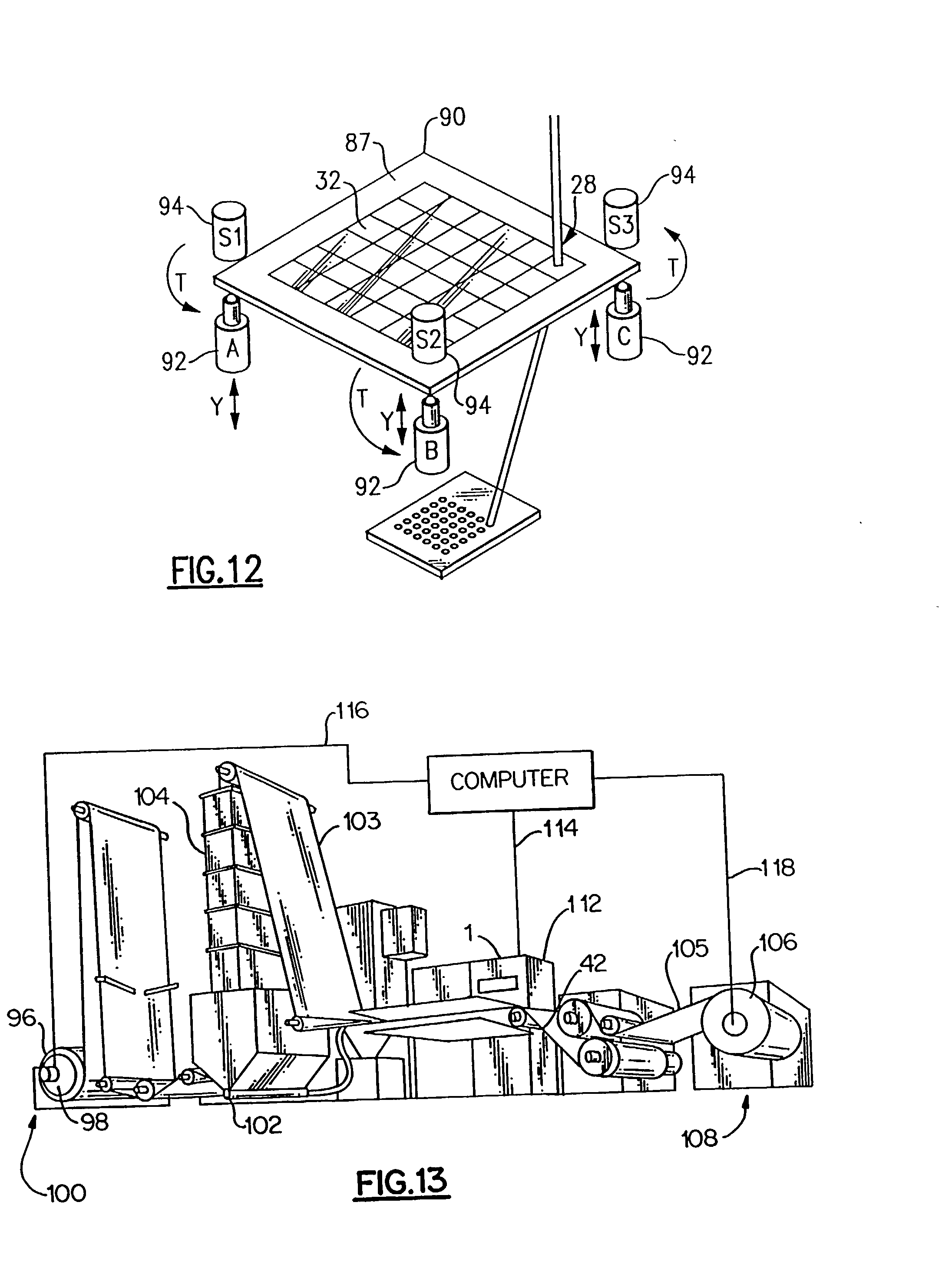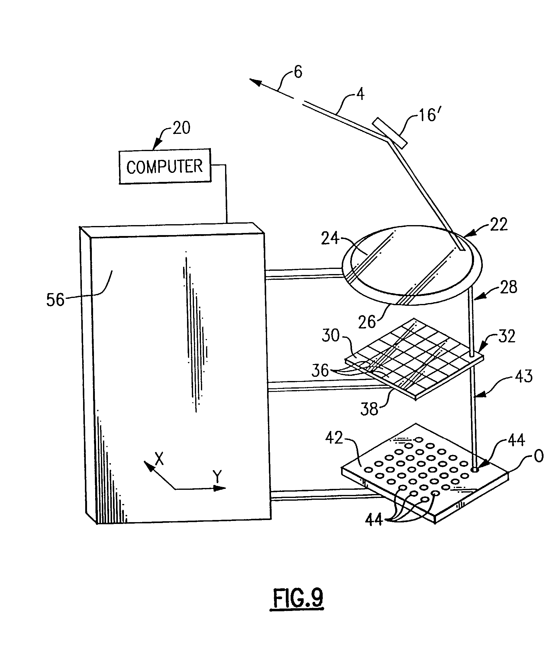 [0001] This application claims benefit of provisional Serial No. 60/315,851 filed Aug. 29, 2001 and is a continuation-in-part of Ser. No. 10/183,806 filed Jun. 26, 2002 which is a continuation-in-part of Ser. No. 09/540,366 filed Mar. 31, 2000, now U.S. Pat. No. 6,420,675 B1, which is a continuation-in-part of Ser. No. 09/514,084 filed Feb. 28, 2000, now U.S. Pat. No. 6,310,701 B1, which claims benefit of provisional Serial No. 60/158,478 filed Oct. 8, 1999. [0002] The present invention relates to a system for burning, drilling, or otherwise forming one or more desired vias, blind vias or other surface indentations, indicia, markings and/or other formations in a surface of a desired object, such as a substrate and, in particular, to the creation of a micro stamping and a micro marking insert, feature or element that can be formed in or used in combination with existing and new firearms to enable the firearm to micro stamp or micro mark a desired identifying indicia, e.g., a code, a symbol, a design or some other identifying mark, into each and every cartridge shell casing upon discharge of the firearm. [0003] There are currently available a variety of systems for forming a hole, a via, a blind via or some other surface indentation in an exterior surface of an object, but many of these systems are very expensive to purchase and operate at relatively slow production rates. [0004] Mechanical forensics and ballistics investigations are undertaken in most crime investigations, accident reconstruction or other situations in which one or more weapons was discharged during the commission of the crime, by accident or perhaps for justifiable cause. Reconstruction, investigation and prosecution, of all incidents of firearm use can be made easier when it is possible to show that a particular weapon was used or discharged during the specific incident being investigated or reconstructed. [0005] Currently, such forensic investigations are expensive and time consuming and require personal training and sophisticated equipment that not every law enforcement department has or can afford. Furthermore, where the used firearm is unavailable, missing, unrecoverable or numerous weapons were discharged, investigators often have limited evidence to work with in order to determine the facts related to the situation at hand. [0006] For example, after committing a crime, the perpetrator of a shooting usually runs away with the gun. Often the only evidence left behind is the discharged bullets themselves, if they can be found, and the spent shell casings. Scratches, marks and/or other indicia on a spent shell casing can assist an investigator with connecting the spent shell casing as being discharged from the barrel of a firearm. Such analysis is often difficult even when the firearm is available, and investigators usually need both the firearm and the spent shell casing in order to compare the scratches, marks and/or other indicia on each and make the connection that the particular shell casing was discharged from the barrel of the firearm in question. [0007] Wherefore, the present invention seeks to overcome the above noted drawbacks of the prior art by providing a system which is relatively inexpensive to purchase and maintain while, at the same time, operates at increased production speeds so that the desired vias, blind vias, or other surface indentations, apertures or other surface markings can be achieved in a surface of a desired object during a shorter period of production time. [0008] A further object of the present invention is to provide a method and apparatus for ablating a desired high-density array or pattern of vias or other surface indentations or formations in a surface of an object to be processed. [0009] Another object of the invention is to facilitate use of a variety of different lasers which operate at different wavelengths and pulse durations, to minimize the associated costs in connection with ablating a high-density array of blind vias, vias or other surface indentations or formations in a surface of an object to be processed. It is to be appreciated that an ultraviolet, a visual, an infrared as well as other types of lasers, extending across the entire spectrum, could be utilized in accordance with the teaching of the present invention. [0010] Yet another object of the present invention is to provide a method and apparatus which allows the number of vias or other indentations or formations, to be formed in a surface of an object being processed, to be easily varied during production of the same by control of the intensity and/or duration of a substantially collimated or non-collimated light beam emanating from the laser. [0011] Still another object of the invention is to provide an apparatus which is relatively less inexpensive to purchase and operate, in comparison to other known systems, while still improving the production rates of the objects to be processed. [0012] A further object of the present invention is to increase the duty cycle of the laser so the laser operates for a shorter duration of time. [0013] Still another object of the present invention is to provide a two command structure which allows a motion control card to synchronize the X-axis and the Y-axis repeat positioners (e.g. the galvanometers), the product handling system (which controls movement of the product to be processed in the X and Y-axes) and the laser so that all three of these components operate at an optimum performance level and allow superior efficiency of the present imaging system than is conventionally achieved in the prior art devices and systems. [0014] The present invention also relates to a control system for controlling movement of a product to be imaged relative to a laser and operation of a laser, the control system comprising: means for obtaining drill position data from a data storage device; means for simultaneously sending necessary signals to alter a path of a laser beam emitted by the laser 