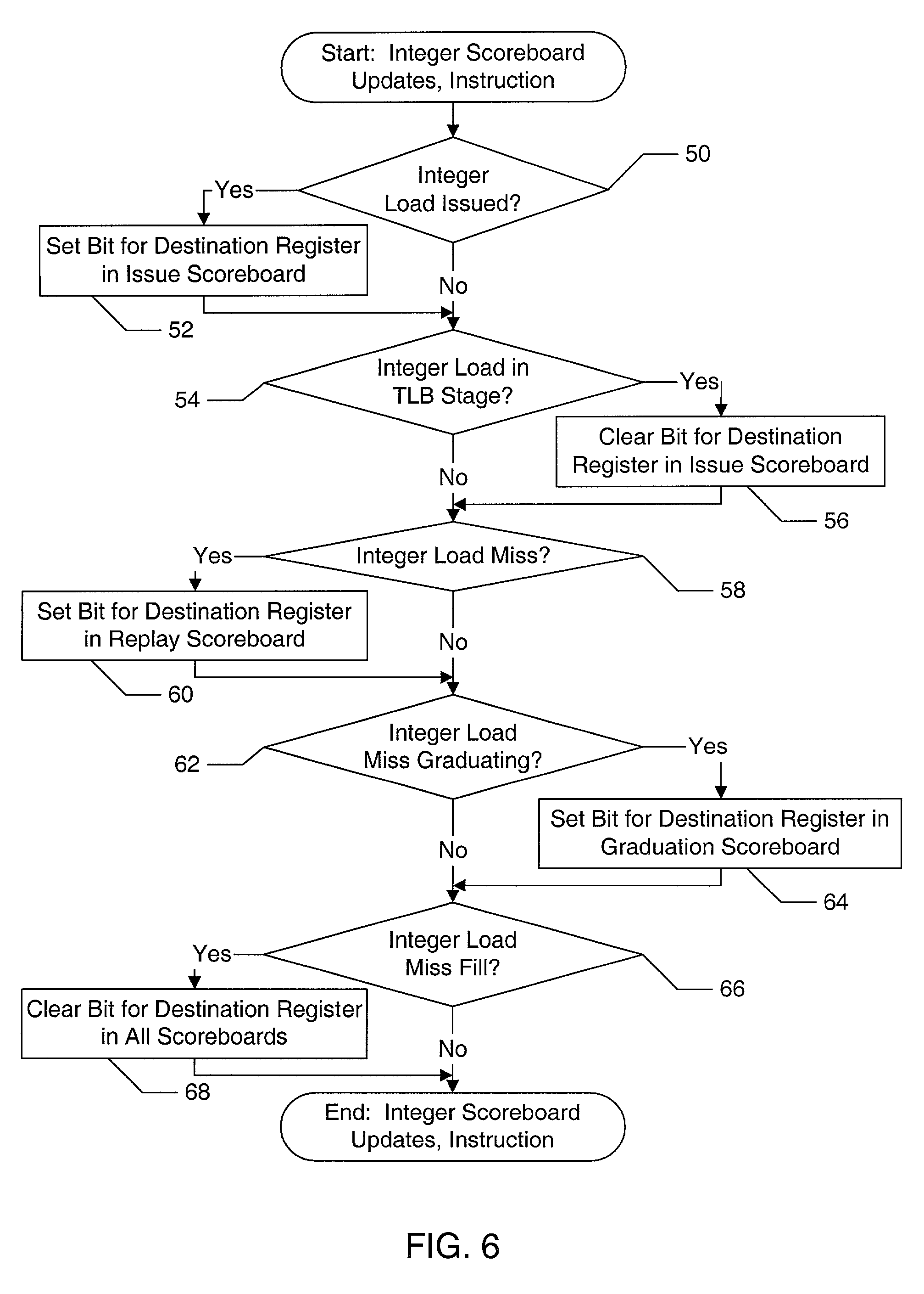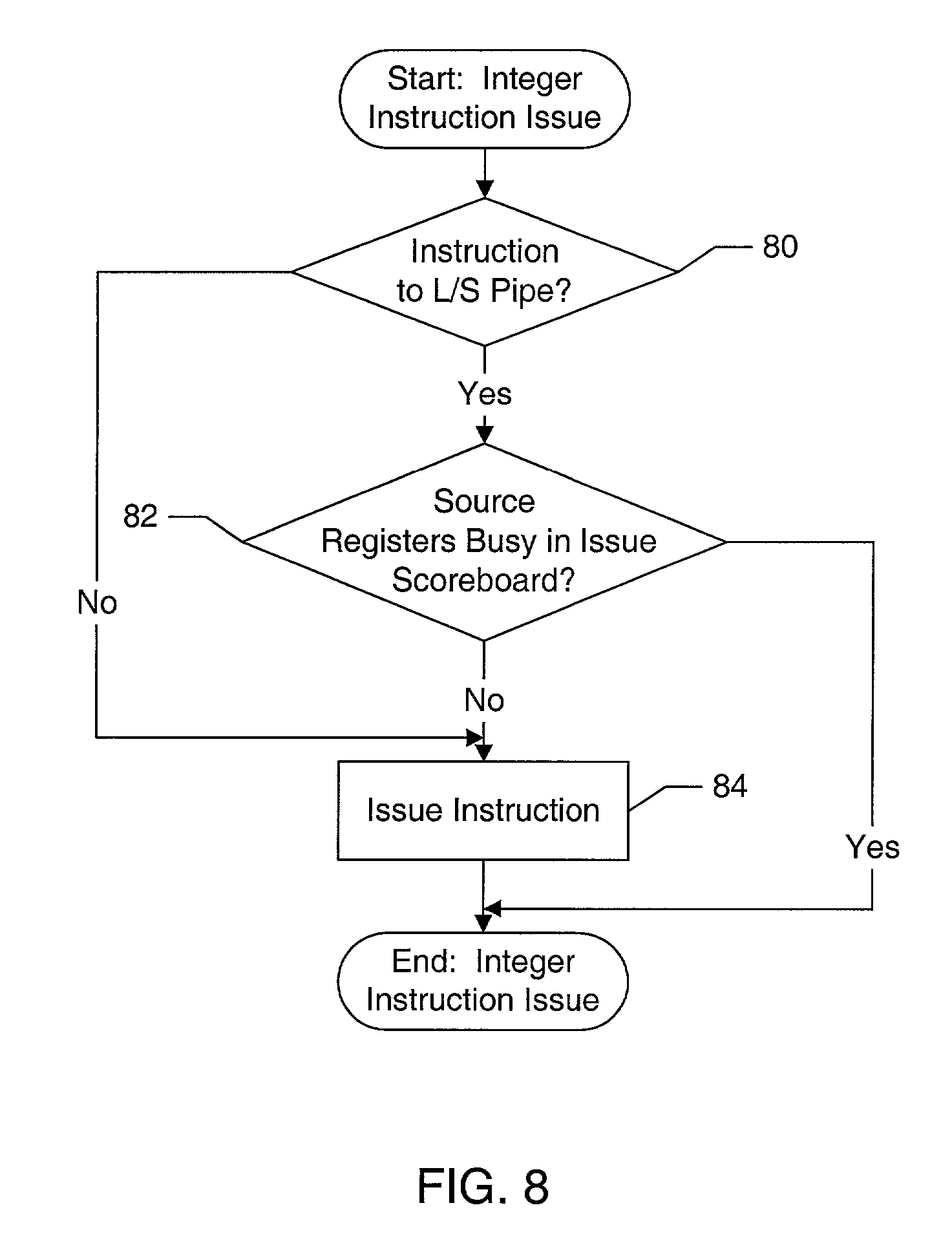 [0001] This application claims benefit of priority to U.S. Provisional Application Serial No. 60/324,344, filed Sep. 24, 2001, which is incorporated herein by reference in its entirety. [0002] 1. Field of the Invention [0003] This invention is related to the field of processors and, more particularly, to dependency checking using scoreboards in processors. [0004] 2. Description of the Related Art [0005] Processors generally include some mechanism for performing dependency checking between instructions. In pipelined processors, dependency checking may be used to ensure that source operands for a first instruction which are generated by one or more preceding instructions (i.e. the preceding instruction writes a result to one of the source operands) are not read for the first instruction until the preceding instruction(s) update the source operands. If multiple parallel pipelines are used, dependency checking may be used to ensure that several instructions which write the same destination operand perform those writes in the correct order. Additionally, if out of order execution is employed, dependency checking may be used to ensure that each instruction receives the proper operands and that updates to operands occur in the correct order. [0006] One mechanism for dependency checking is to use a scoreboard to track which operands (e.g. registers) have pending writes corresponding to instructions which are outstanding within the processor. The scoreboard may be checked to determine if dependencies exist for a given instruction. [0007] An apparatus for a processor includes a first scoreboard, a second scoreboard, and a control circuit coupled to the first scoreboard and the second scoreboard. The control circuit is configured to update the first scoreboard to indicate that a write is pending for a first destination register of a first instruction in response to issuing the first instruction into a first pipeline. The control circuit is configured to update the second scoreboard to indicate that the write is pending for the first destination register in response to the first instruction passing a first stage of the pipeline. Replay may be signaled for a given instruction at the first stage. In response to a replay of a second instruction, the control circuit is configured to copy a contents of the second scoreboard to the first scoreboard. [0008] In some embodiments, the copying of the second scoreboard to the first scoreboard may delete the effects of instructions which have not reached the first stage from the first scoreboard. Thus, the first scoreboard may be recovered to a state which reflects the replay of the second instruction. [0009] In various embodiments, additional scoreboards may be used for detecting different types of dependencies (e.g. source operands which are read at different points in the pipeline, read after write dependencies vs. write after write dependencies, etc.). The appropriate scoreboard may be used to check for each type of dependency, and the scoreboards may be updated at different times to indicate that a write is no longer pending due to a given instruction. [0010] The following detailed description makes reference to the accompanying drawings, which are now briefly described. [0011] [0012] [0013] [0014] [0015] [0016] [0017] [0018] [0019] [0020] [0021] [0022] [0023] [0024] [0025] [0026] [0027] [0028] [0029] [0030] [0031] [0032] [0033] [0034] While the invention is susceptible to various modifications and alternative forms, specific embodiments thereof are shown by way of example in the drawings and will herein be described in detail. It should be understood, however, that the drawings and detailed description thereto are not intended to limit the invention to the particular form disclosed, but on the contrary, the intention is to cover all modifications, equivalents and alternatives falling within the spirit and scope of the present invention as defined by the appended claims. [0035] Processor Overview [0036] Turning now to [0037] Generally speaking, the fetch/decode/issue unit 14 is configured to generate fetch addresses for the instruction cache 12 and to receive corresponding instructions therefrom. The fetch/decode/issue unit 14 uses branch prediction information to generate the fetch addresses, to allow for speculative fetching of instructions prior to execution of the corresponding branch instructions. Specifically, in one embodiment, the branch prediction unit 16 include an array of branch predictors indexed by the branch address (e.g. the typical two bit counters which are incremented when the corresponding branch is taken, saturating at 11 in binary, and decremented when the corresponding branch is not taken, saturating at 00 in binary, with the most significant bit indicating taken or not taken). While any size and configuration may be used, one implementation of the branch predictors 16 may be 4 k entries in a direct-mapped configuration. Additionally, in one embodiment, the branch prediction unit 16 may include a branch target buffer comprising an array of branch target addresses. The target addresses may be previously generated target addresses of any type of branch, or just those of indirect branches. Again, while any configuration may be used, one implementation may provide 64 entries in the branch target buffer. Still further, an embodiment may include a return stack used to store link addresses of branch instructions which update a link resource (“branch and link” instructions). The fetch/decode/issue unit 14 may provide link addresses when branch instructions which update the link register are fetched for pushing on the return stack, and the return stack may provide the address from the top entry of the return stack as a predicted return address. While any configuration may be used, one implementation may provide 8 entries in the return stack. [0038] The fetch/decode/issue unit 14 decodes the fetched instructions and queues them in one or mo
