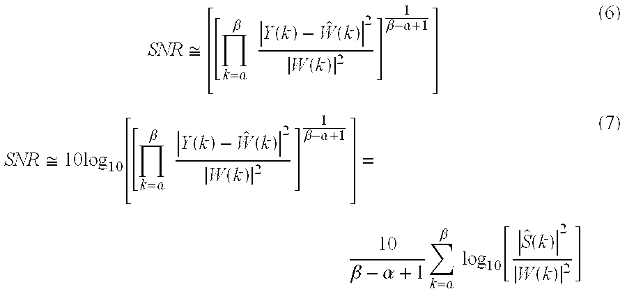 [0143] s(n)=nthtime sampleof the received signal [0144] w(n)=nthtime sample of the received noise [0145] N=window length in time samples used to compute spectrum [0146] S(k)−kthfrequency suband of the received signal spectrum [0147] W(k)=kthfrequency suband of the received noise spectrum [0148] Y(k)=kthfrequency suband of signal plus noise spectrum [0149] j={square root}{square root over (−1)} [0150] where S(k) represents a DFT of the signal; W(k) represents a DFT of noise; Y(k) represents a DFT of signal-plus-noise; s(n) represents a transmit signal; w(n) represents a noise signal. [0151] According to an embodiment of the present invention, these transforms may be computed with Fast Fourier Transform (FFT). A real 2N input sequence may be packed into an N point complex sequence as shown below. According to an embodiment of the present invention, transform weights may be computed on the fly using the method shown below. Frequency cells may be estimated using a number of methods other than a conventional DFT, such as autoregressive (AR), moving average (MA), autoregressive moving average (ARMA), quadrature mirror filter (QMF) filter bank, and other methods. [0152] To illustrate a geometric SNR, a geometric mean may be defined as follows: