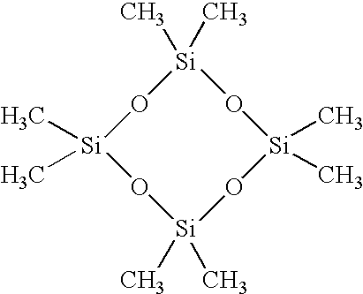 [0119] R=alkyl [0120] R′=alkyl, vinyl [0121] (l) Cyclic polysiloxanes of the type D 3, D 4, D 5, wherein D 3, D 4 and D 5 are taken to mean cyclic polysiloxanes having 3, 4 or 5 units of the type —O—Si(CH3)2—. For example, octamethylcyclotetrasiloxane=D 4