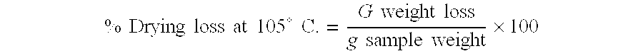 [0207] The result is stated to one decimal place. [0208] Determination of Ignition Loss (2 h at 1000° C., Relative to Dried Material (2 h at 105° C.) [0209] Basis for Ignition Loss Determination [0210] Ignition loss is determined at 1000° C. At this temperature, the chemically bound water is driven off as well as the physically bound water. [0211] Equipment for Determining Ignition Loss [0212] Porcelain crucible with crucible lid [0213] Muffle furnace [0214] Analytical balances (readability 0.1 mg) [0215] Desiccator [0216] Performance of Ignition Loss Determination [0217] At variance with DIN 55 921, 0.3-1 g of the unpredried material are weighed out to an accuracy of 0.1 mg into a previously calcined porcelain crucible with crucible lid and calcined for 2 hours at 1000° C. in a muffle furnace. [0218] Care must be taken to avoid dusting. It has proved advantageous to place the weighed samples in the muffle furnace while it is still cold. [0219] Slow heating of the furnace avoids relatively severe air turbulence in the porcelain crucibles. [0220] Once a temperature of 1000° C. is reached, calcination is continued for a further 2 hours. The sample is then covered with a crucible lid and the crucible placed in a desiccator over blue gel to determine the weight loss. [0221] Evaluation of Ignition Loss Determination [0222] Since ignition loss is determined relative to the sample dried for 2 h at 105° C., the following calculation formula is obtained: