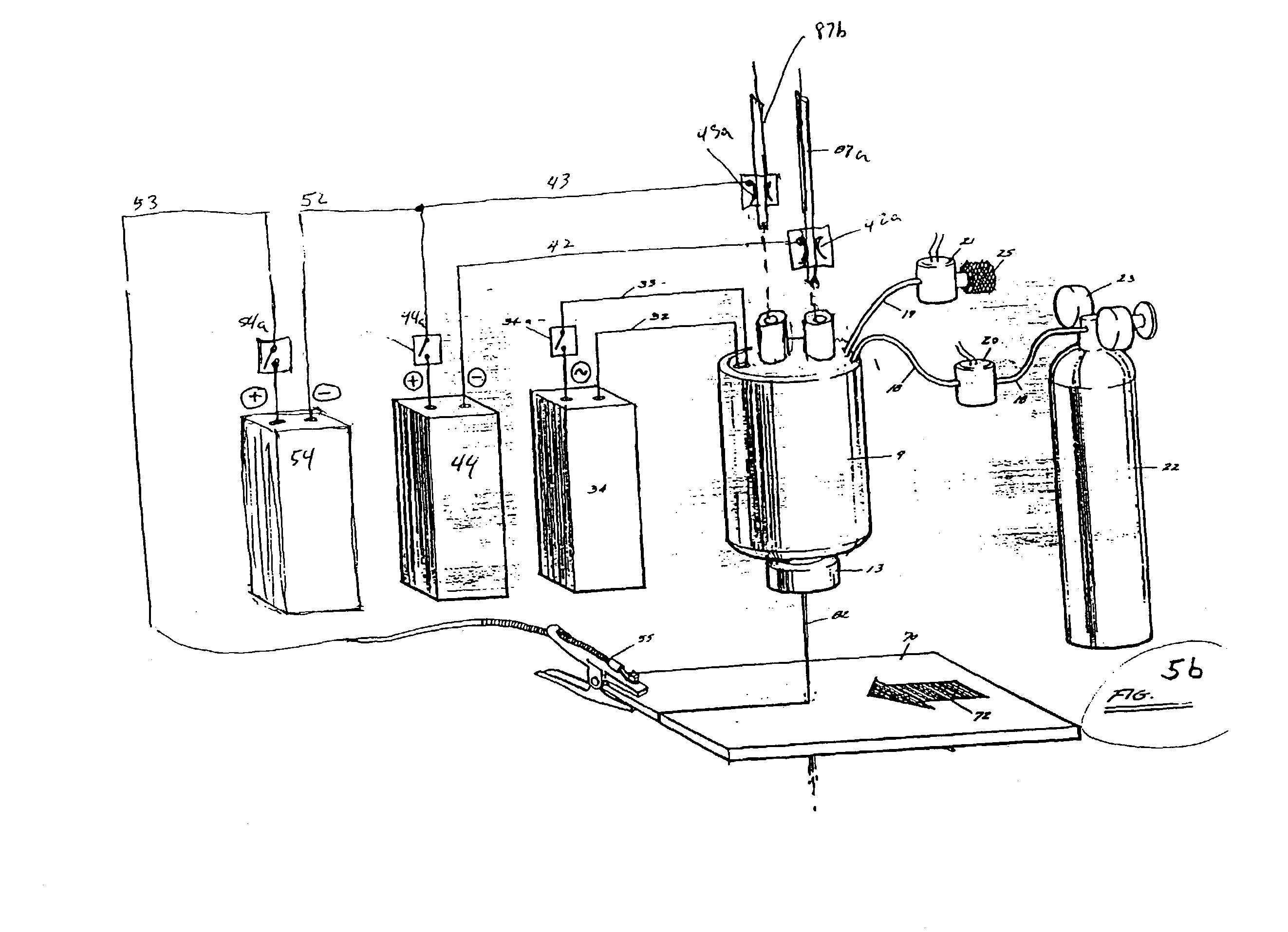 [0064] In another aspect, the present invention is directed to a welding apparatus and a method of welding a workpiece using the apparatus of [0065] [0066] Referring to [0067] In one embodiment, cutting of non-metallic, non-conductive, and insulating materials can be accomplished by allowing the molten stream to collect in an electrically conductive pot as shown in [0068] In another embodiment, an induction heated crucible, as shown in [0069] Also, shown in the embodiment in [0070] In another embodiment, an induction heated crucible and a feedstock heater, as shown in [0071] In one embodiment, a filter 47 is placed in series with the jetting nozzle, the conductive fluid flows first through the filter and then flows to the nozzle where the jet is formed. [0072] In one embodiment, in place of using a plug rod (26), sealing ball (26 [0073] In another embodiment, reversing the polarity of the stream heating power supply (54), or using AC power may prove useful in suppressing observed arcing and sparking on the workpiece surface, and minimizing workpiece oxidation. [0074] In another embodiment, the present invention features methods of introducing the cutting fluid feedstock (87) into the pressure vessel (10) of the jetting head (9) including feeding the feedstock as either rod, wire, powder, or liquid metal. In one example, the feedstock is introduced into the pressure vessel under the full operating pressure. [0075] In one embodiment, the invention features using an electrical current flow in a stream (jet) of metal to raise the stream temperature. In one example, the invention features the use of the liquid metal jet with added current (I2R heating) for the purposes of cutting and welding. [0076] In one embodiment, the invention features the use of pure metals as the cutting fluids, including iron, aluminum, tin, nickel, titanium, gold, platinum, silver, magnesium, and copper, in combination with the I2R heat addition process. [0077] In one embodiment, the invention features the use of low melting temperature metals having high boiling point temperatures for the cutting fluid, in combination with the I2R energy addition process. Examples of suitable cutting (working) fluid include but are not limited to: aluminum and aluminum alloys; tin and tin alloys. [0078] In one embodiment, the invention features the use of the beneficial effects of alloying in the cut, which reduces the melting temperature of the workpiece in the vicinity of the metal jet and kerf front, in combination with the I2R heating process. [0079] In one embodiment, the invention features the use of non-melting additions to the working fluid, such as, ceramic particles and refractory metal particles, which would help the cutting process by abrasion and enhancing heat transfer by stirring the interaction zone of the jet with the kerf front. The size of particles could range from about 0.2 to about 20 microns. [0080] In one embodiment, the invention features the use of the levitating force of induction to stop the liquid metal fluid flow from the crucible. [0081] In one embodiment, the invention features the technique of separating the high pressure requirement of a holding vessel from the high temperature requirement. This is done by placing both the holding vessel (crucible) and its heating source in the pressurizing environment. [0082] In one embodiment, the invention features a technique of cutting non-metals or, in general, non-electrically conducting materials using the I2R heated liquid stream and by make the electrical connections to the stream at the up-stream side by contact to the working fluid in the pressure vessel (crucible) and on the down-stream side by contact by the stream to a separate current collection means located beneath the workpiece. [0083] In one embodiment, the invention features the use of the present invention for the purpose of ‘Surface Cladding’ or ‘Surface Welding’, wherein a workpiece is coated (or cladded) with the working fluid. The working fluid stream is manipulated so as to coat the workpiece with the working fluid. [0084] In one embodiment, the invention features the use of the present invention for the purpose of ‘3-D Forming’, wherein a three dimensional structure is built-up (or formed) from the working fluid. The working fluid stream is manipulated under computer-code control, so as to build a freestanding, three dimensional structure with the working fluid. One principal reason why liquid metal jet presents a significant advantage over existing techniques in welding, coating, and forming is that the working material is liquid. This permits liquid of unique composition to be formulated in the crucible by supplying several types of feed mixture can be varied over a much larger range than in the solid state. When this liquid is rapidly cooled to the solid phase at rates of 103-106K/sec, an alloy with non-equilibrium composition is produced. This composition can be tailored to create solid materials with unique properties not generally available in conventional materials. As an example, special magnetic properties can be created in Fe-alloys. High-strength aluminum (and other lightweight metal) alloys can be made this way due to the refined grain structure that is produced. This is the technique that gas-assist metal atomization processes use to produce exotic metal powders that are used in the powder metal and thermal spray industry. The process of rapid cooling/rapid solidification of liquid metals is known to those skilled in the art. [0085] The ability to accurately control the location and size of the deposition spot of the liquid metal jet (apparently, within microns) is an exceptional advantage when compared to existing spray technology that uses gas jets and powder. Such techniques produce deposition spot sizes on the order of millimeters and suffer from overspray and low deposition efficiency. [0086] Furthermore, the liquid metal jet diameter may be made sufficiently
