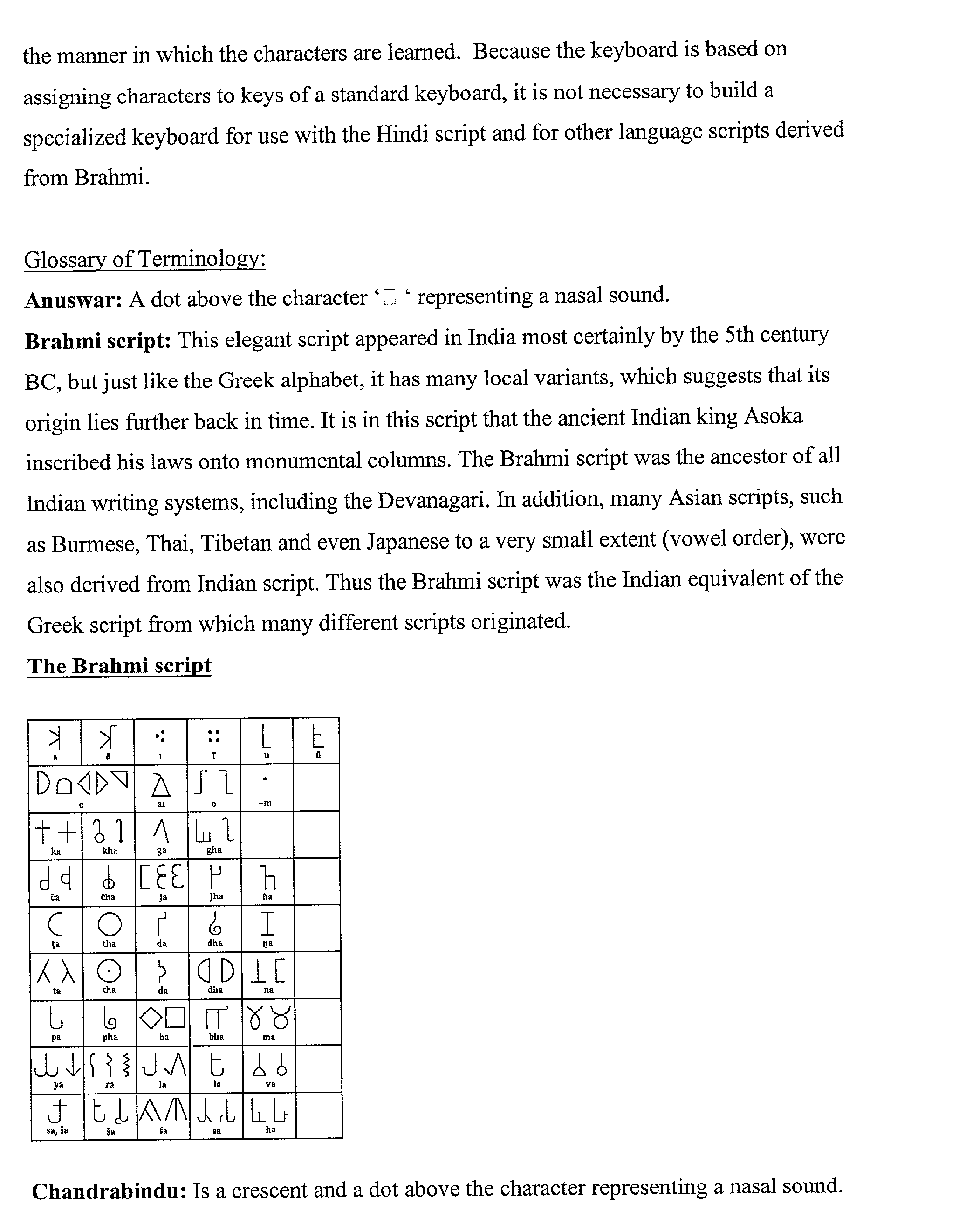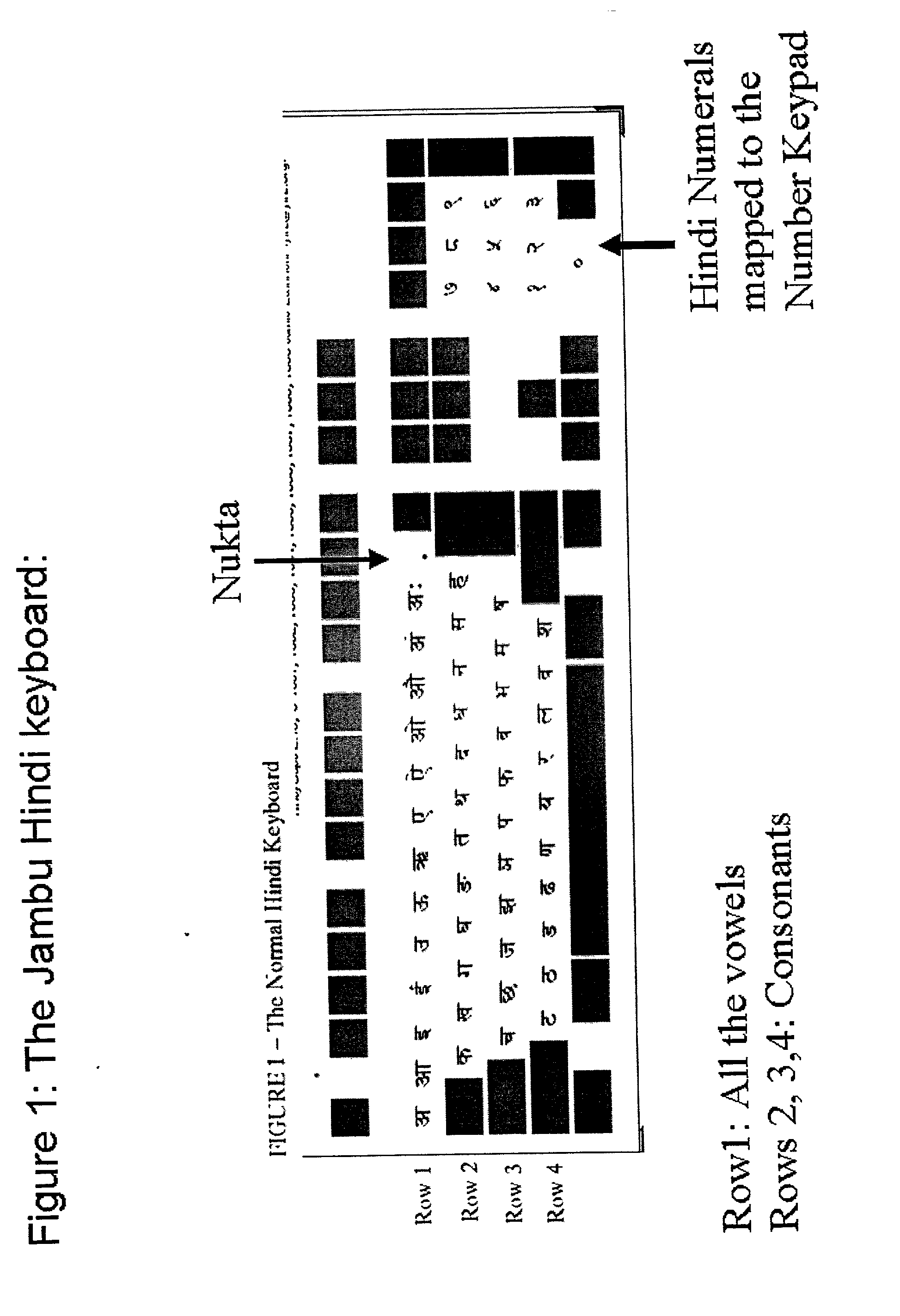 [0082] G0and G1character sets: The first 128 characters in the ASCII 8-bit encoding scheme are referred to as the lower (G0) character set. These typically code the lower and upper case Roman English alphabet. The remaining character set space (upper character set, extended ASCII character set or G1set) are not used in English but are used to code special additional characters e.g., umlauts in German, accented French characters or the Cyrillic alphabet of the Russian language. [0083] Halant: This is a sign (an oblique dash) below the leading character of a pair (usually consonants) which signifies a conjunct of the two characters. This is an accepted way of joining 2 consonants instead of using an additional unique character. The cuts down the number of keys by an order of magnitude. [0084] Inscript keyboard layout: The official Indian language keyboard encoding vector which encodes the whole Devanagari script. This includes Hindi, Marathi and Sanskrit languages. [0085] ISCII (INDIAN SCRIPT CODE FOR INFORMATION EXCHANGE) is an encoding method which allows unique codes for all Indian script characters. It is essentially a subset of the Unicode standard. [0086] Keyboard Encoding Vector: The order in which the letters of a script are arranged on the keyboard [0087] Matra: This is a vowel diacritic sign. [0088] Nukta: This is the dot below, i.e., “.”—it is used for deriving other characters in Devanagari, Punjabi and when Urdu is written using Devanagari. [0089] Om: A commonly used Hindu religious symbol. [0090] Script: A complete set of characters used for the written form of one or more languages, e.g., the Roman script for the English Language, i.e., a, b, c . . . x,y,z. [0091] Vargs: These are the initial consonants phonetically grouped in 5's. There are 5 such Varg groups of consonants. Additional, final consonants are the Non-Varg consonants (8 in Hindi). [0092] Viram: This is a full stop sign in Hindi (|) Verse endings in Sanskrit use a double Viram (∥). [0093] Visarg: Comes after a vowel and represents the ‘h’ sound. In Tamil this represents the Aytham ‘∴’ sound. [0094] The above specification, examples and data provide a complete description of the manufacture and use of the composition of the invention. Since many embodiments of the invention can be made without departing from the spirit and scope of the invention, the invention resides in the claims hereinafter appended. BACKGROUND OF THE INVENTION
