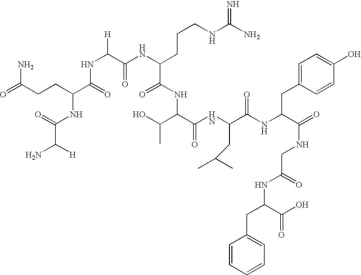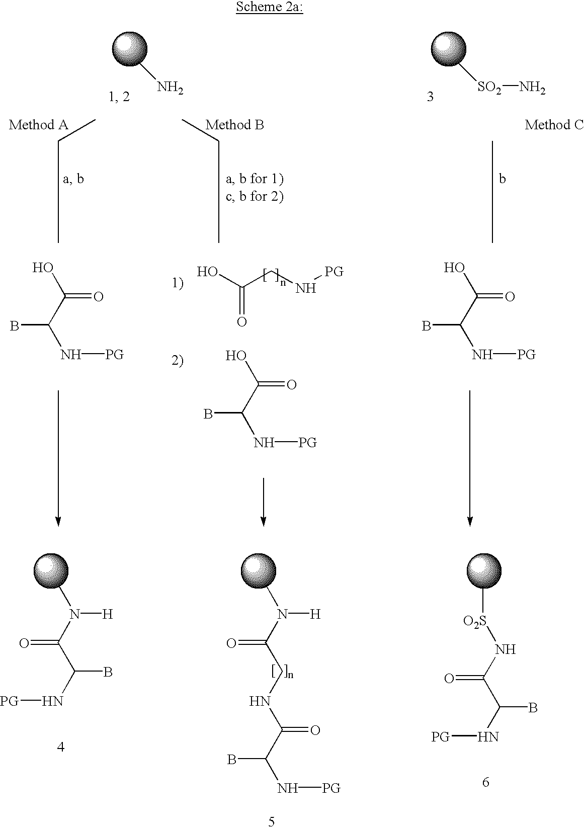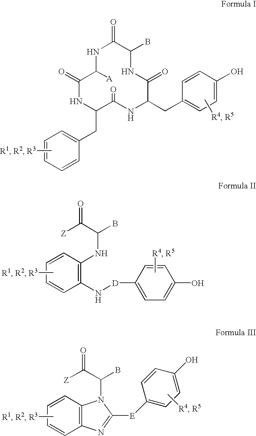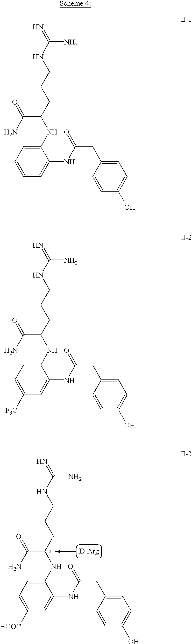 [0042] wherein B, D, E, R1, R2, R3, R4, R5and Z represent the groups described above and the spherical element in Schemes 2a and 2b represents the remainder of the MBHA resin, Rink-Amide resin or 4-sulfamylbutyryl AM resin, as appropriate. [0043] Particularly preferred compounds that may be prepared by the procedures described above are: [0044] (A) Cyclic tetrapeptides of Formula I (see Scheme 3): [0045] Cyclo(-Gly-(p-chloro)Phe-Tyr-D-Arg-) [0046] [Compound I-1] (SEQ ID NO. 5) [0047] Cyclo(-Gly-(p-chloro)Phe-Tyr-(p-amino)Phe-) [0048] [Compound I-2] (SEQ ID NO. 6) [0049] Cyclo(-Gly-(p-chloro)Phe-Tyr-(p-guanidino)Phe-) [0050] [Compound I-31 (SEQ ID NO. 7) [0051] Cyclo(-Gly-(p-amino)Phe-Tyr-D-Arg-) [0052] [Compound I-4] (SEQ ID NO. 8) [0053] Cyclo(-Thr-(p-chloro)Phe-Tyr-D-Arg-) [0054] [Compound I-5] (SEQ ID NO. 9) [0055] (B) Non-peptides of Formula II (see Scheme 4): [0056] N-5-guanidinopentanamide-(2S)-yl-2-N-(p-hydroxyphenylacetyl) phenylenediamine [Compound II-1] [0057] N-5-guanidinopentanamide-(2S)-yl-2-N-(p-hydroxyphenylacetyl)-4-trifluorometyl-phenylenediamine [Compound II-2] [0058] N-5-guanidinopentanamide-(2R)-yl-2-N-(p-hydroxyphenylacetyl)-4-carboxy-phenylenediamine [Compound 11-3] [0059] N-5-guanidinopentanamide-(2R)-yl-2-N-(p-hydroxyphenylacetyl)-4-(p-chlorobenzoyl)-phenylenediamine [Compound II-4] [0060] (C) A non-peptide of Formula III (see Scheme 4): [0061] N-5-guanidinopentanamide-(2R)-yl-2-(p-hydroxybenzyl)-5-carboxybenzimidazole [Compound III-1]
