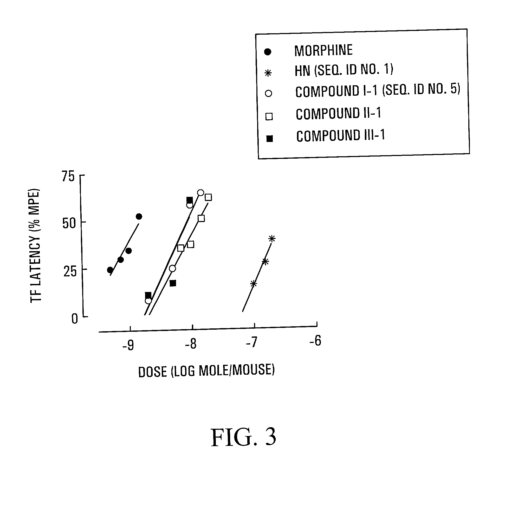 [0062] Pharmaceutical compositions comprising a compound of the present invention, or a pharmaceutically acceptable salt thereof, in admixture with a pharmaceutically acceptable carrier, diluent or excipient may be formulated by methods generally known in the art. The preparation and administration of pharmaceutical compositions are generally known in the art, for example as described in U.S. Pat. No. 5,169,833, the disclosure of which is hereby incorporated by reference. [0063] Thus, the active compounds of the invention may be formulated for oral, buccal, transdermal (e.g., patch), intranasal, parenteral (e.g., intravenous, intramuscular or subcutaneous) or rectal administration or in a form suitable for administration by inhalation or insufflation. [0064] For oral administration, the pharmaceutical compositions may take the form of, for example, tablets or capsules prepared by conventional means with pharmaceutically acceptable excipients such as binding agents (e.g., pregelatinised maize starch, polyvinylpyrrolidone or hydroxypropyl methylcellulose); filters (e.g., lactose, microcrystalline cellulose or calcium phosphate); lubricants (e.g., magnesium stearate, talc or silica); disintegrants (e.g., potato starch or sodium starch glycollate); or wetting agents (e.g., sodium lauryl sulphate). The tablets may be coated by methods well known in the art. Liquid preparations for oral administration may take the form of, for example, solutions, syrups or suspensions, or they may be presented as a dry product for constitution with water or other suitable vehicle before use. Such liquid preparations may be prepared by conventional means with pharmaceutically acceptable additives such as suspending agents (e.g., sorbitol syrup, methyl cellulose or hydrogenated edible fats); emulsifying agents (e.g., lecithin or acacia); non-aqueous vehicles (e.g., almond oil, oily esters or ethyl alcohol); and preservatives (e.g., methyl or propyl p-hydroxybenzoates or sorbic acid). [0065] For buccal administration the composition may take the form of tablets of lozenges formulated in conventional manner. [0066] The active compounds of the invention may be formulated for parenteral administration by injection, including using conventional catheterization techniques or infusion. Formulations for injection may be presented in unit dosage form, e.g., in ampules or in multi-dose containers, with an added preservative. The compositions may take such forms as suspensions, solutions or emulsions in oily or aqueous vehicles, and may contain formulating agents such as suspending, stabilizing and/or dispersing agents. Alternatively, the active ingredient may be in powder form for reconstitution with a suitable vehicle, e.g., sterile pyrogen-free water, before use. [0067] The active compounds of the invention may also be formulated in rectal compositions such as suppositories or retention enemas, e.g., containing conventional suppository bases such as cocoa butter or other glycerides. [0068] For intranasal administration or administration by inhalation, the active compounds of the invention are conveniently delivered in the form of a solution or suspension from a pump spray container that is squeezed or pumped by the patient or as an aerosol spray presentation from a pressurized container or a nebulizer, with the use of a suitable propellant, e.g., dichlorodifluoromethane, trichlorofluoromethane, dichlorotetrafluoroethane, carbon dioxide or other suitable gas. In the case of a pressurized aerosol, the dosage unit may be determined by providing a valve to deliver a metered amount. The pressurized container or nebulizer may contain a solution or suspension of the active compound. Capsules and cartridges (made, for example, from gelatin) for use in an inhaler or insufflator may be formulated containing a powder mix of a compound of the invention and a suitable powder base such as lactose or starch. [0069] The active compounds or pharmaceutical compositions thereof are generally administered to or used in animals, for example in humans for medical purposes or in domestic animals or farm animals for veterinary purposes. Preferably, the animal is a mammal, particularly a human. Selection of appropriate doses would depend on the particular patient and on the compound being used and is ultimately decided by a medical practitioner. Generally, doses may range, depending on the compound, from 200 times less to 500 times more than would be used for morphine, which could be administered, for example, 1 to 4 times per day. [0070] The active compounds of the present invention are analgesic in various animal pain assays, particularly after central (i.c.v., i.t.) or peripheral (oral, i.p. and/or i.v.) administrations. They also potentiate the action of morphine, therefore, pharmaceutical compositions comprising the active compounds of the present invention in admixture with morphine are contemplated within the scope of the invention. The active compounds may be administered in conjunction with morphine to enhance the effectiveness of morphine. [0071] The active compounds also block morphine tolerance and, particularly in isolated rat alveolar macrophages, they inhibit the induction of COX-2 and the secretion of PGE2in response to lipopolysaccharide (LPS). [0072] The active compounds show potent analgesic activity (1.4 to 135 fold as potent as HN (SEQ ID NO. 1)) in the mouse writhing test. Significant analgesic activity is observed after both central (i.c.v.) and peripheral (oral, i.p.) administrations of compounds I-1 (SEQ ID NO. 5), II-1 and III-1. The various compounds also display high analgesic activity in the mouse tail-flick (i.c.v.) pain assay. None of the compounds (i.c.v.) induce motor dysfunction at analgesic doses as assessed by the mouse rotarod assay. In addition, compound II-1 potentiates the analgesic effects of morphine in the mouse writhing test and inhibits morphine tolerance in the mouse tail-flick assay. In isolated ra