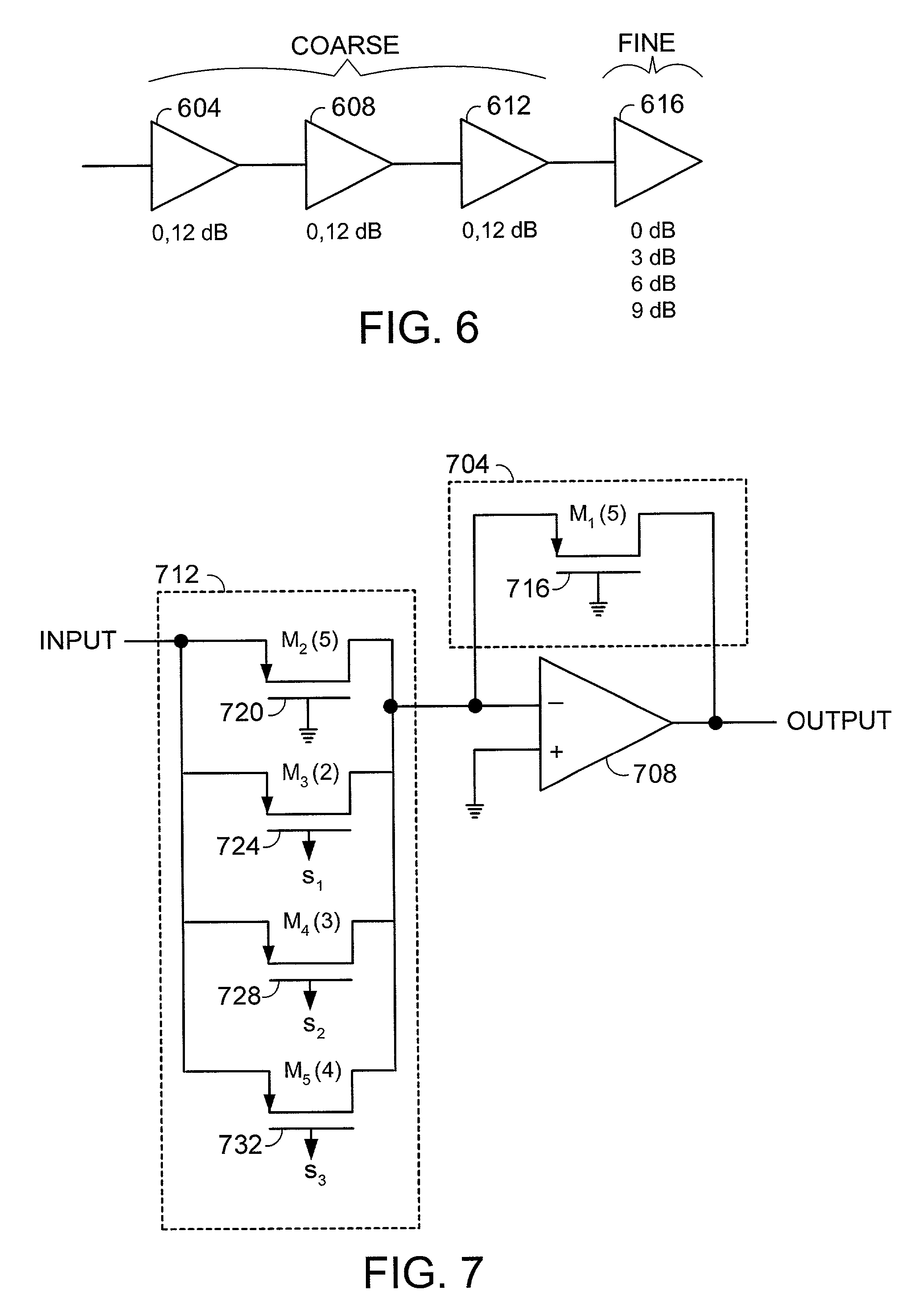 an operational amplifier (Op Amp); a first group of MOSFETs coupled in parallel in a feedback loop of the Op Amp between the Op Amp's output and negative input; and a second group of MOSFETs coupled to the negative input of the Op Amp wherein the MOSFETs of the first and second groups are matched and further wherein the number of selectable transistors in the second group of MOSFETs is chosen so that increments of gain in terms of dB may be achieved from zero dB to a dB value that is equal to or less than a gain step size produced by the at least one PGA for providing a coarse incremental step. 2. The radio receiver of 3. The radio receiver of 4. The radio receiver of 5. The radio receiver of 6. The radio receiver of 7. The radio receiver of 8. The radio receiver of 9. The radio receiver of 10. A radio receiver formed within an integrated circuit, comprising: