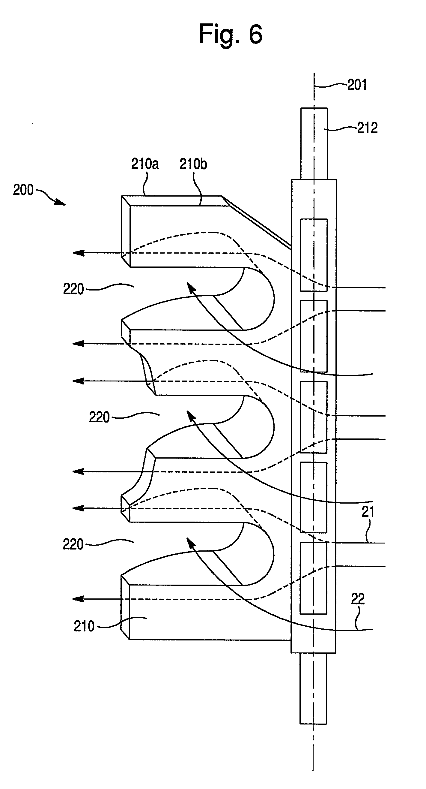 a first conduit for a first airflow; a second conduit for a second airflow; a merging region downstream of said first and second conduits for merging said first and second air flows; and a mixing structure comprising a first side upstream of said merging region, a second side upstream of said merging region, and a substantially curved passageway leading from said first side to said second side for mixing said first and second air flows at the merging region, wherein said mixing structure defines a distribution door pivotally mounted within said system. 7. The airflow system of 8. The air flow system of 9. The air flow system of 10. The air flow system of 11. The airflow system of 12. The air flow system of 13. The airflow system of 14. An air flow system for a vehicle air conditioning system, comprising