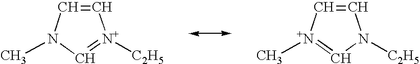 [0009] Delocalization of the positive charge on this five-membered heterocyclic ring is made possible by the two illustrated resonant hybrid cation structures. The resonant structures are believed to be one of the properties of such cations responsible for lowering the melting point of their derivative salts. The other reason such salts are molten at ambient temperatures is the asymmetry afforded by the difference in the aliphatic groups attached to the nitrogen atoms.