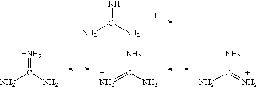 [0015] Guanidine is a unique amine in which three nitrogen atoms are joined to the same carbon atom. As shown in the equation below, because protonation of the unsaturated nitrogen makes possible the delocalization of the positive charge over all three nitrogen atoms, guanidine is one of the strongest organic bases known.