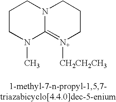[0023] Alicyclic and aromatic groups are also preferred substituents, especially those including the guanidine nucleus in one, two, or three heterocyclic rings. An example of this type of compound is 1-methyl-7-n-propyl-1,5,7-triazabicyclo[4.4.0]dec-5-enium.