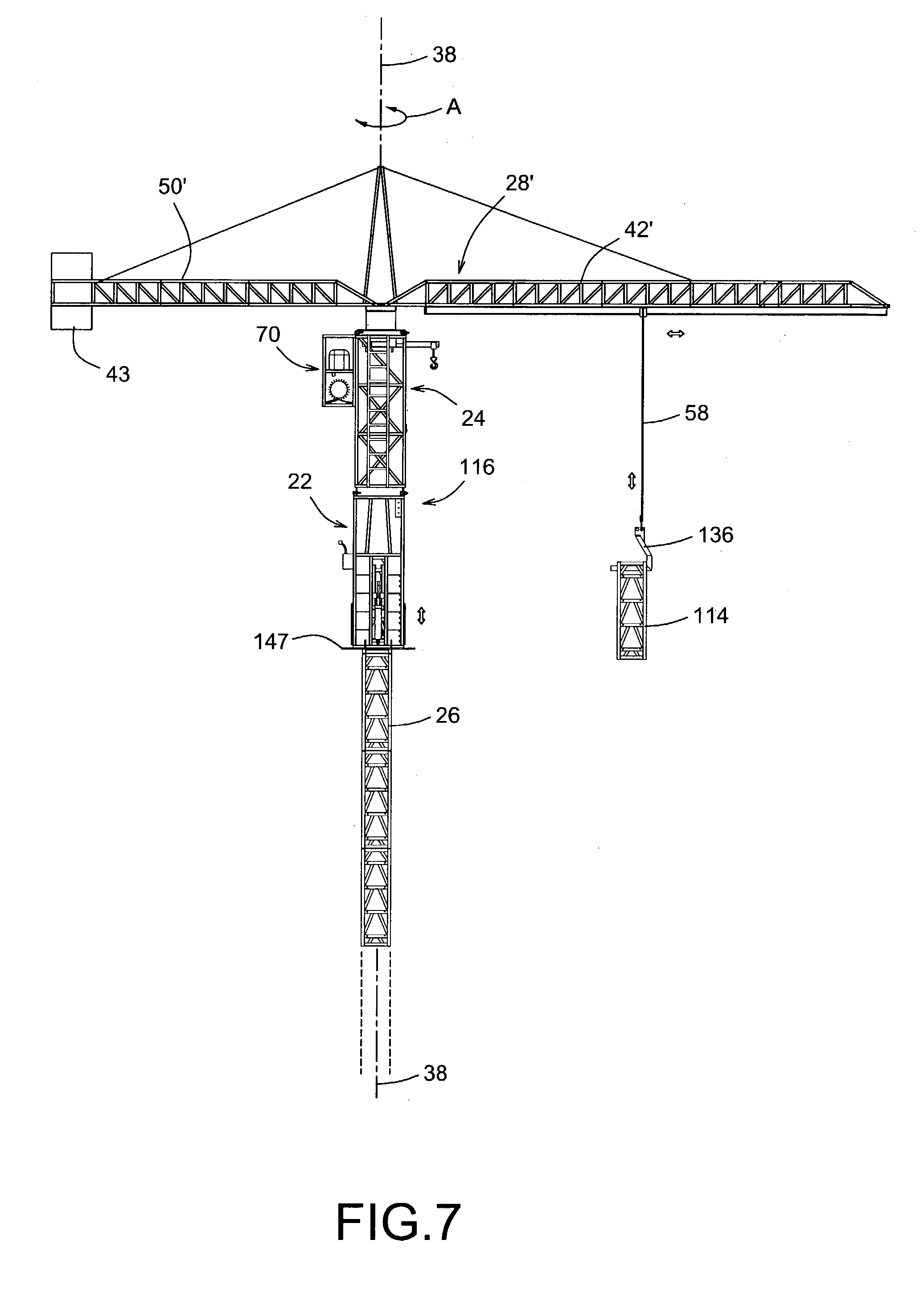 1. A self-erecting tower crane for use on a construction site, said tower crane being supported at a top end of a tower, the tower including tower sections assembled in an end-to-end relationship relative to one another along a tower axis, said tower crane comprising: