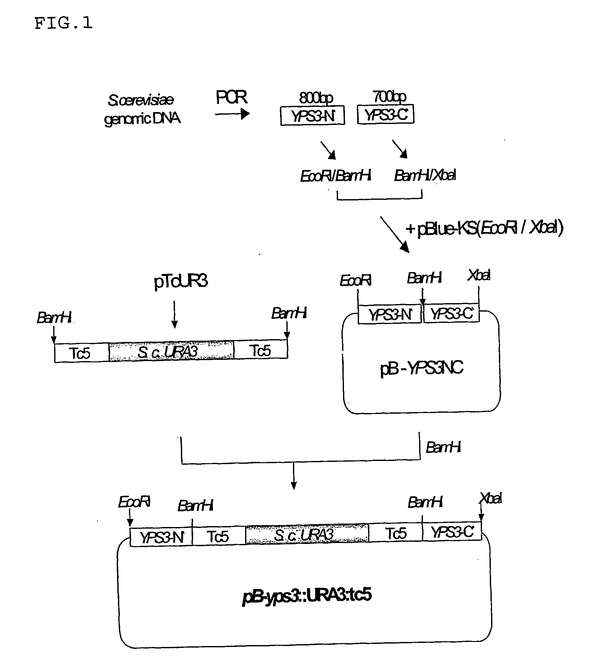 [0034] N- and C-terminal fragments of YPS3 gene necessary for the homology recombination leading to the disruption of the YPS3 gene were produced by PCR (polymerase chain reaction) using two pairs of primers, which were synthesized on the basis of the YPS3 base sequence of Saccharomyces cerevisiae, registered in GenBank. For the convenience of gene manipulation later, a set of primers (5′-GACGAATTCCAGAAACGTCTGAGTGGAG-3′ and 5′-GCAGGATCCGTACTCTACCGAATGCCG-3′) for amplifying the N-terminal fragment were designed to have recognition sites of EcoRI and BamHI at their respective 5′-terminal sites (underlined parts) while restriction sites of BamHI and XbaI were introduced into 5′-terminal sites of a set of primers (5′-CGCGGATCCCTATGCAGACCAGTGTGG-3′ and 5′-CGCTCTAGACTGCATGCAAGGTCTGAC-3′) for the amplification of the C-terminal fragment (underlined parts). The PCR was carried out in a thermal cycler, such as that manufactured by Perkin Elmer, identified as “GeneAmp PCR 2400”, with 25 thermal cycles, each consisting of 95° C./30 sec for denaturing, 55° C./30 sec for annealing, and 72° C./30 sec for extending, so as to produce a 800 bp and a 700 bp DNA fragment encoding an N-terminal and a C-terminal region of the YPS3 gene region, respectively, from the genomic DNA of Saccharomyces cerevisiae. The PCR products, that is, the YPS3 N-terminal and C-terminal fragments, were double digested with restriction enzymes EcoRI/BamHI and BamHI/XbaI, respectively, followed by ligating the two restriction enzyme digests together into the pBluescript II KS(+) vector (Stratagen) which was previously treated with EcoRI/XbaI. To the BamHI recognition site located between the two terminal fragments of the resulting recombinant vector pB-YPS3NC, a URA3 pop-out selection marker was introduced, so as to construct the pB-yps3::URA3:tc5 vector for use in disrupting the YPS3 gene.