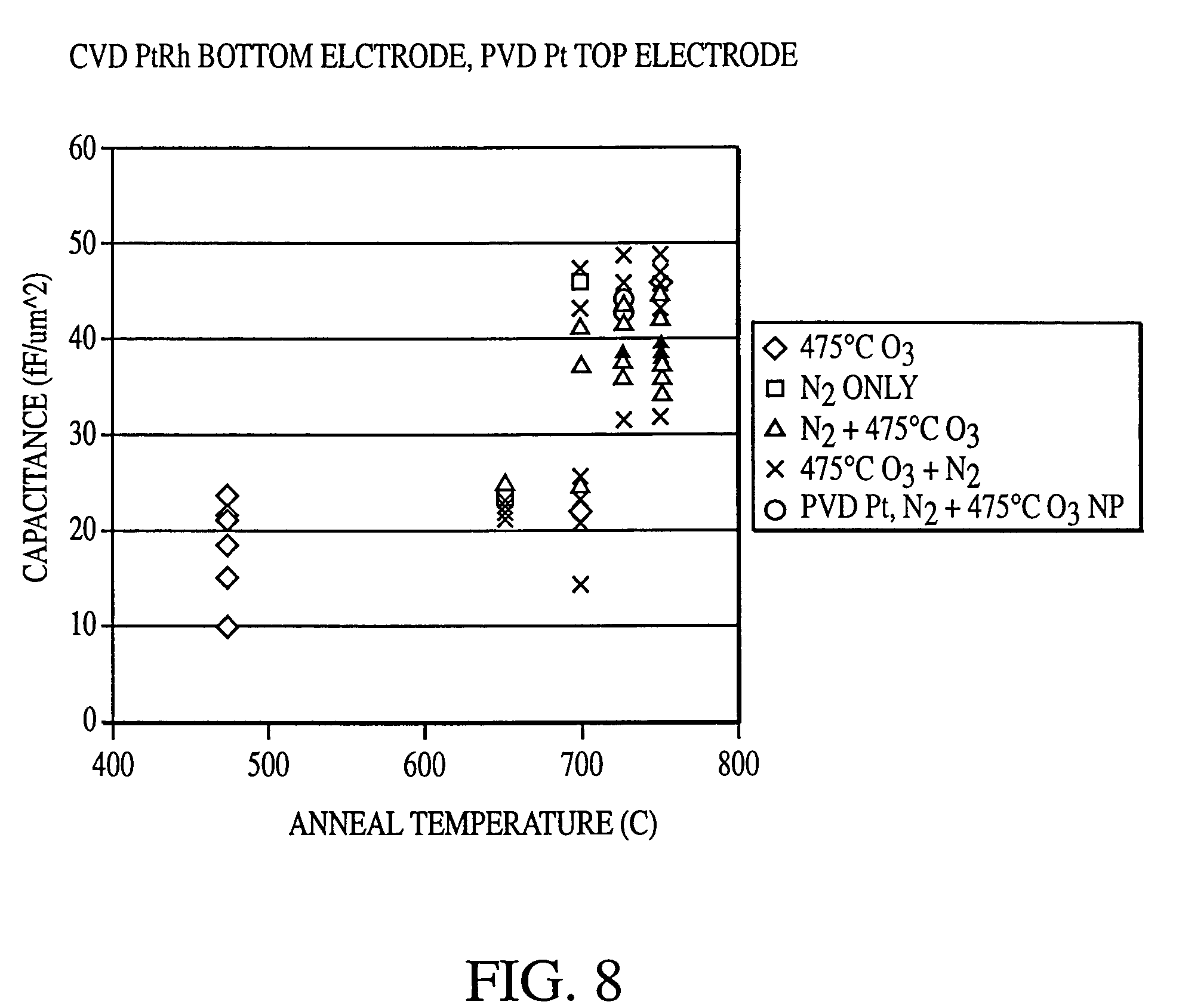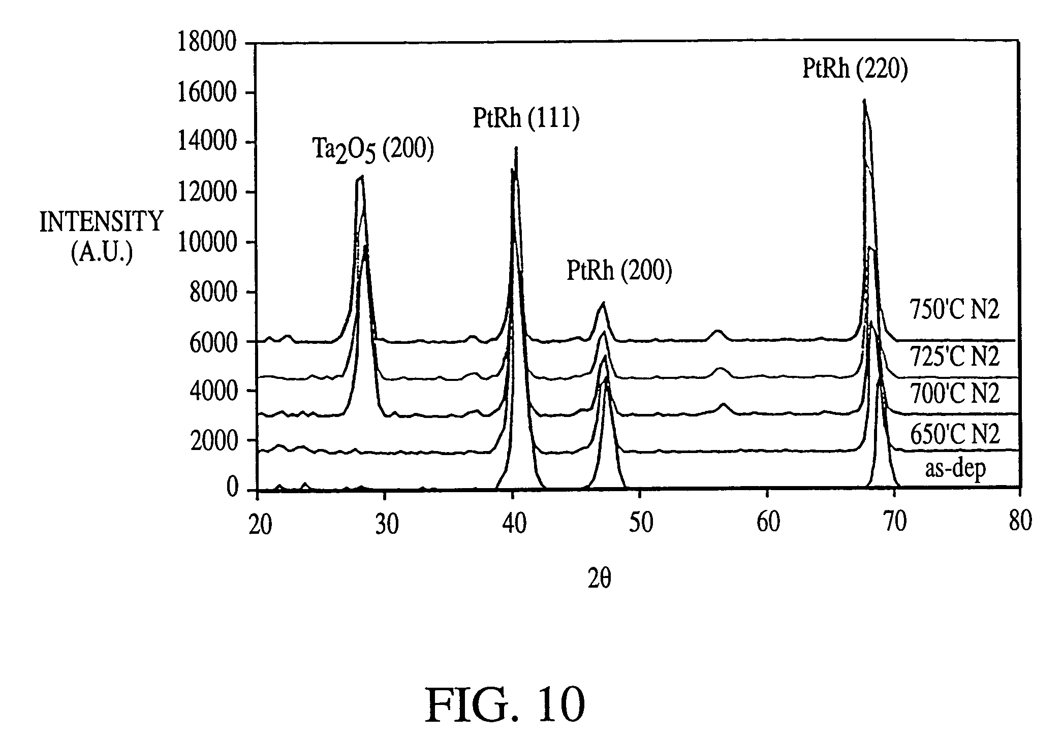 a bottom electrode formed over a conductive plug, said bottom electrode comprising at least one of a platinum, rhodium, and a platinum-rhodium alloy layer; a nitrogen and oxygen annealed tantalum pentoxide layer formed over said bottom electrode, said annealed tantalum pentoxide having crystal growth primarily in the <200> direction; and an upper electrode formed over said tantalum pentoxide layer, said upper electrode comprising at least one of a platinum, rhodium, and a platinum-rhodium alloy layer. 66. The capacitor of 67. The capacitor of 68. The capacitor of 69. The capacitor of 70. The capacitor of 71. The capacitor of 72. The capacitor of 73. The capacitor of 74. The capacitor of 75. An integrated circuit capacitor comprising: