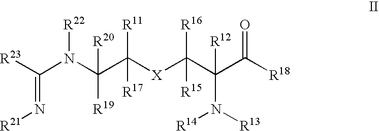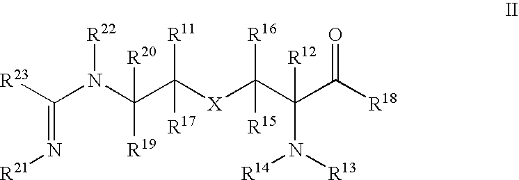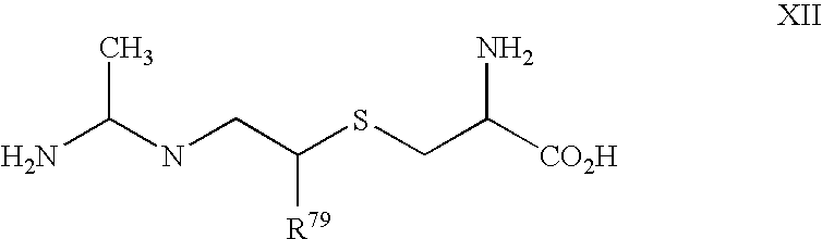 [0140] wherein R1 is selected from C1-4 alkyl, C3-4 cycloalkyl, C1-4 hydroxyalkyl, and C1-4 haloalkyl. The description of U.S. Pat. No. 6,355,689 states that R1 is preferably C1-4 alkyl, and most preferably, methyl. Specific embodiments disclosed in U.S. Pat. No. 6,355,689 and suitable for use in the present methods and compositions include: [0141] S—((R)-2-(1-iminoethylamino)propyl)-L-cysteine; [0142] S—((S)-2-(1-iminoethylamino)propyl)-L-cysteine; [0143] S—((R/S)-2-(1-iminoethylamino)propyl)-L-cysteine; [0144] S—((R)-2-(1-iminoethylamino)propyl )-D-cysteine; [0145] S—((S)-2-(1-iminoethylamino)propyl)-D-cysteine; [0146] S—((R/S)-2-(1-iminoethylamino)propyl)-D-cysteine; [0147] S—((R/S)-2-(1-iminoethylamino)butyl)-L-cysteine; [0148] S—((R/S)-2-(1-iminoethylamino,2-cyclopropyl)ethyl)-L-cysteine; and [0149] S—((R/S)-2-(1-iminoethylamino,3-hydroxy)propyl)-L-cysteine, [0150] or a pharmaceutically acceptable salt, solvate, or physiologically functional derivative thereof. [0151] INOS inhibitors that are believed to exert their inhibitory effect by inhibiting the dimerization of iNOS are also contemplated for use in the present ivention and include those compounds disclosed in international publication number WO 9837079, published Aug. 27, 1998, international patent application PCT/US98/03176 by Berlex Laboratories, Inc., 15049 San Pablo Avenue, P.O. Box 4099, Richmond, Calif. 94804-0099, and Pharmacopeia, Inc., Princeton Forrestal Center, 101 College Road East, Princeton, N.J. 08540. Briefly, that publication discloses compounds of formulae XIII, XIV and XV: