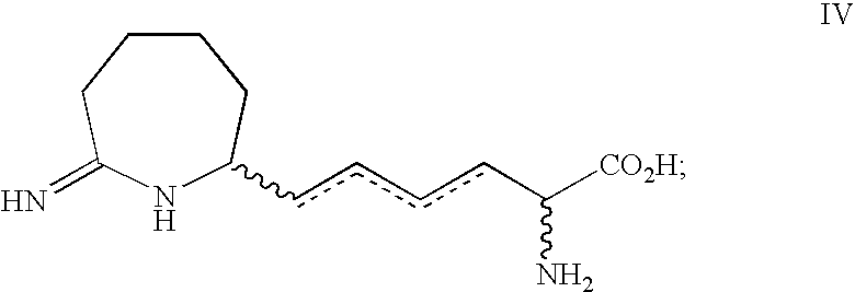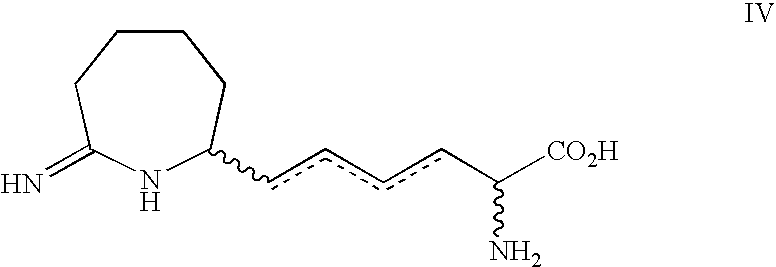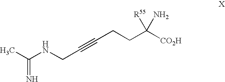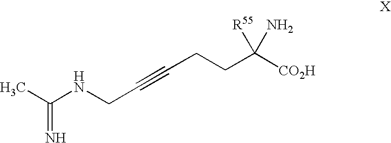 [0609] A sample of the product of Example BB-1 (0.956 g, 1.9 mmol) in MeOH (80 mL) was deprotected by method of Example AA-1 with Zn dust (1.5 g) and 60% HOAc/H2O (40 mL). The resulting product was purified by reverse phase chromatography to afford the title material (0.248 g) in 28% yield. [0610] The product of Example BB-2 (0.248 g, 0.53 mmol) was transformed into the title product by the method of Example AA using HCl (2 mL), H2O (2 mL), CH3CN (4 mL). The crude product was purified by reverse phase chromatography to afford the title product of Example BB (0.073 g) in 57% yield. [0611] MH+240.3, MH+Na+486.4. [0612]1H NMR (CD3OD, δ ppm) 1.2-2.0 (m, 6H), 2.35 (t, 2H), 2.55-2.82 (m, 4H), 3.68 (dt, 1H), 4.05 (t, 1H), 5.65 (m, 2H). [0613] [0614] [0615] DL-Alanine ethyl ester hydrochloride (5 g, 32.5 mmol) was suspended in toluene (50 mL). Triethyl amine (4.5 mL, 32.5 mmol) was added followed by phthalic anhydride (4.8 g, 32.5 mL). The reaction flask was outfitted with a Dean-Stark trap and reflux condenser and the mixture was heated at reflux overnight. Approximately 10 mL of toluene/water was collected. The reaction mixture was cooled to room temperature and diluted with aqueous NH4Cl and EtOAc. The layers were separated and the aqueous layer was extracted with EtOAc (3×). The ethyl acetate extract was washed with brine, dried over MgSO4, filtered and concentrated in vacuo to give the title phthalyl-protected amino ester as a white crystalline solid in near quantitative yield. [0616]1H NMR (400 MHz, CDCl3, δ ppm): 1.2 (t, 3H), 1.6 (d, 3H), 4.2 (m, 2H), 4.9 (q, 1H), 7.7 (m, 2H), 7.9 (m, 2H) [0617] [0618] Potassium phthalimide (18.5 g, 0.1 mol) was added to a 250 mL round bottomed flask containing 1,4-butene dichloride (25 g, 0.2 mol). The reaction mixture was heated to 150° C. for 1.5 h. The mixture was cooled to room temperature and was partitioned between brine and Et2O. The organic layer was dried with MgSO4, filtered and concentrated in vacuo. The residue was recrystallized from hot ethanol to give the title 1-chloro-4-phthalimidobutene (8.9 g, 39%) as orange crystals. [0619] HRMS calcd. For C12H10ClNO2: m/z=236.0478 [M+H]. Found: 236.0449 [0620]1H NMR (300 MHz, CDCl3, δ ppm□ 4.1 (d, 2H), 4.3 (d, 2H), 5.9 (m, 2H), 7.7 (m, 2H), 7.9 (m, 2H) [0621] [0622] A sample of the product of Example CC-2 (2.3 g, 9.8 mmol) was dissolved in acetone (50 mL). Nal (3.2 g, 21 mmol) was added and the mixture was refluxed overnight. After cooling to room temperature, Et2O was added and the mixture was washed sequentially with sodium thiosulfate and brine. The organic layer was dried with MgSO4, filtered and concentrated in vacuo to give the title iodide (2.8 g, 87.5%) as a light yellow solid that was used without further purification. [0623]1H NMR (400 MHz, CDCl3, δ ppm): 3.8 (d, 2H), 4.2 (d, 2H), 5.7 (m, 1H), 6.0 (m, 1H), 7.7 (m, 2H), 7.9 (m, 2H) [0624] Mass (M+1)=328 [0625] [0626] A solution of KHMDS (2.6 g, 13.3 mmol) in THF (50 mL) was cooled to −78° C. A solution of the product of Example CC-1 (2.2 g, 8.87 mmol) in THF (15 mL) was added and 1,3-dimethyl-3,4,5,6-tetrahydro-2(1H)-pyrimidinone (DMPU, 1.0 mL, 8.87 mL) was added immediately thereafter. After the solution was stirred at −78° C. for 40 minutes, a solution of the product of Example CC-3 (2.9 g, 8 87 mmol) in THF (15 mL) was added. The flask was removed from the cold bath and was stirred at room temperature for 3 h. The reaction mixture was partitioned between saturated aqueous NaHCO3 and EtOAc. The organic extract was washed with brine, dried over MgSO4, filtered and concentrated in vacuo to give the desired bis-pththalyl protected amino ester as a yellow solid. This residue was chromatographed on silica gel (1:1 hexanes: EtOAc) and gave 1.4 g (35%) of the title material as a white solid. [0627]1H NMR (300 MHz, CDCl3, δ ppm□1.2 (t, 3H), 1.6 (d, 3H), 2.8 (dd, 1H), 3.1 (dd, 1H), 4.2 (m, 4H), 5.6 (m, 1H), 5.8 (m, 1H), 7.6 (m, 4H), 7.7 (m, 2H), 7.9 (m, 2H) [0628] Mass (M+H)=447 [0629] [0630] The product of Example CC-4 (0.78 g, 1.76 mmol) was dissolved in a mixture of formic acid (10 mL, 95%) and HCl (20 mL, concentrated HCl) and was refluxed for 3 days. The reaction mixture was cooled to 0° C. and filtered to remove phthalic anhydride. After concentrating in vacuo (T<40° C.), the title unsaturated alpha methyl lysine was obtained as a white solid (0.38 g, 95%), which was used without further purification. [0631]1H NMR (300 MHz, D2O, δ ppm): 1.4 (s, 3H), 2.4 (dd, 1H), 2.6 (dd, 1H), 3.5 (d, 2H), 5.7 (m, 2H) [0632] Mass(M+H)=317 [0633] The product of Example CC-5 (0.2 g, 0.86 mmol) was dissolved in H2O (8 mL) and was brought to pH 9 with 2.5 N NaOH. Ethyl acetimidate—HCl (0.42 g, 3.4 mmol) was added in four portions over 1 h. After 1 h, the mixture was acidified to pH 4 with 10% HCl and was concentrated in vacuo. The residue was then passed through a water-washed DOWEX 50WX4-200 column (H form, 0.5 N NH4OH eluent). The residue was concentrated in vacuo, acidified to pH 4 with 10% HCl, and concentrated to give the title product (17 mg, 6%) as an oil. [0634] HRMS calcd. For C9H17N3O2: m/z=200.1399 [M+H]. Found: 200.1417 [0635]1H NMR (400 MHz, D2O, δ ppm): 1.4 (s, 3H), 2.1 (s, 3H), 2.5 (dd, 1H), 2.6 (dd,1H), 3.8 (d, 2H), 5.6 (m, 2H) [0636] [0637] [0638] (2S,4S)-3-Benzoyl-2-(tert-butyl)-4-methyl-1,3-oxazolidin-5-one was prepared according to Seebach's procedure. Seebach, D.; Fadel, A. Helvetica Chimica Acta 1985, 68, 1243. [0639] [0640] A solution of KHMDS (0.65 g, 3.24 mmol), DMPU (0.33 mL, 2.7 mmol) and THF (40 mL) was cooled to −78° C. A solution of (2S,4S)-3-benzoyl-2-(tert-butyl)-4-methyl-1,3-oxazolidin-5-one (Example DD-1) (0.70 g, 2.7 mmol) in THF (10 mL) was added dropwise. After 45 min, a solution of the product of Example CC-3 (0.88 g, 2.7 mmol) in THF (10 mL) was added. The reaction mixture was stirred at room temperature for 2 h and quenched with saturated aqueous NaHCO3. The layers were separated and the aqueous la