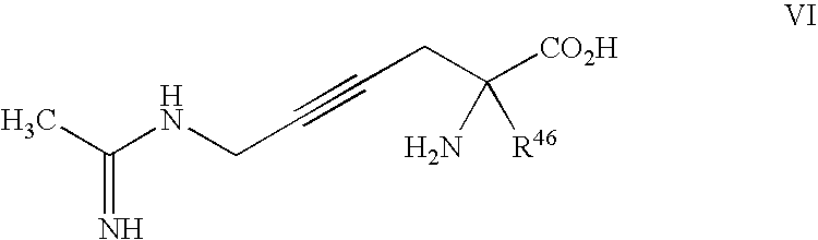 [0116] or a pharmaceutically acceptable salt or prodrug thereof, wherein: [0117] R46 is C1-C5 alkyl, said C1-C5 alkyl optionally substituted by halo or alkoxy, said alkoxy optionally substituted by one or more halo. [0118] Another exemplary selective iNOS inhibitor useful in the present invention is represented by Formula VII