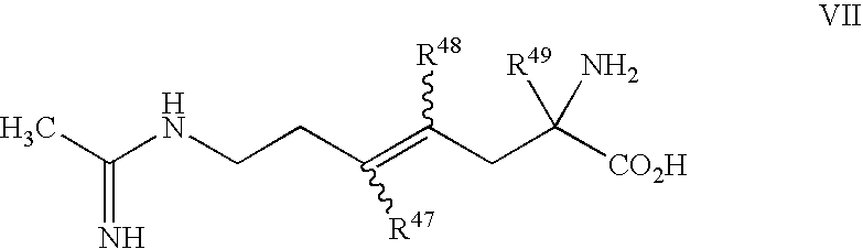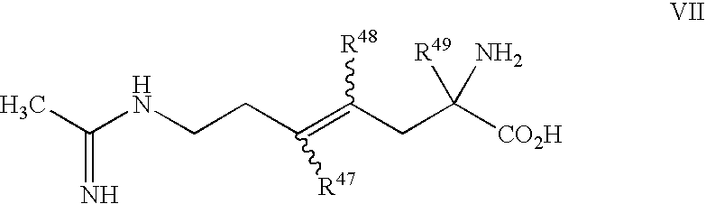 [0119] or a pharmaceutically acceptable salt or prodrug thereof, wherein: [0120] R47 is selected from the group consisting of hydrogen, halo, C1-C5 alkyl and [0121] C1-C5 alkyl substituted by alkoxy or one or more halo; [0122] R48 is selected from the group consisting of hydrogen, halo, C1-C5 alkyl and [0123] C1-C5 alkyl substituted by alkoxy or one or more halo; [0124] R49 is C1-C5 alkyl or C1-C5 alkyl be substituted by alkoxy or one or more halo. [0125] Another exemplary selective iNOS inhibitor useful in the present invention is represented by Formula VIII