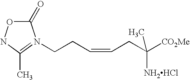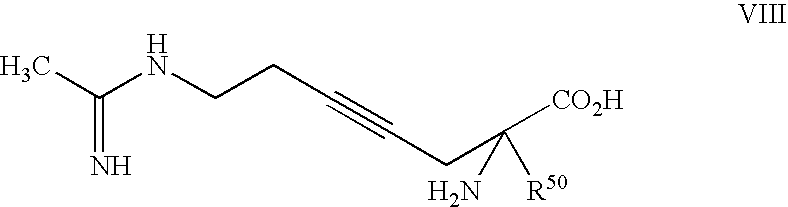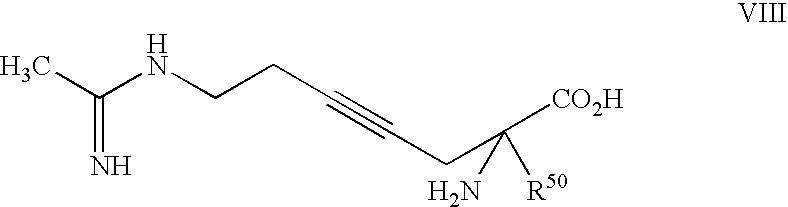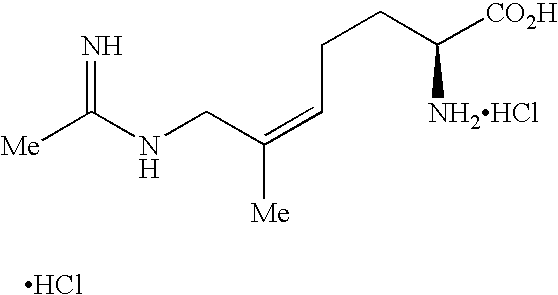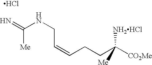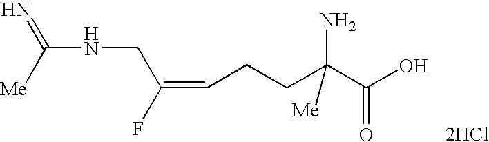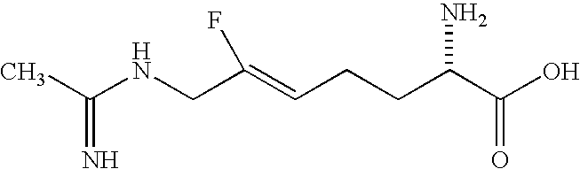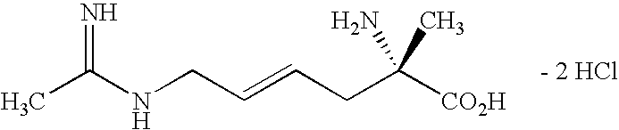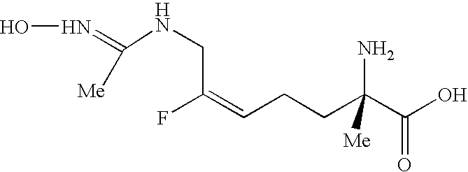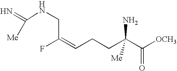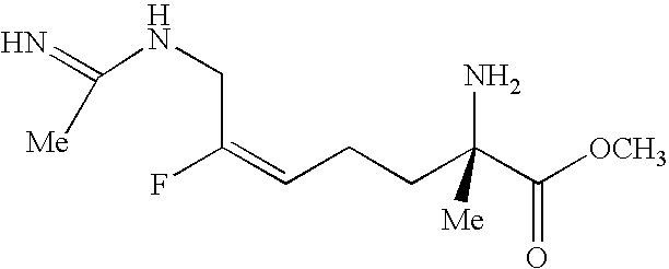 [0294] EX-F-5) The product from EX-F-4 (22.5 g, 0.047 mol) was dissolved in 112 mL of methanol. Vigorous stirring was begun and 225 mL of 40% acetic acid in water followed by zinc dust (11.5 g, 0.177 mmol) was added. The stirring reaction was placed under reflux (approx. 60° C.) for 2.5 h, at which time HPLC analysis showed that most of the starting material had been consumed. The reaction was cooled and the Zn was filtered from the reaction mixture through celite, washing the celite well with additional methanol. The filtrate and methanol washings were combined and concentrated. The resulting oily-white solid was washed with methylene chloride (2×500 mL) and filtered through a celite pad, an additional 500 mL methylene chloride wash was performed. The filtrates were combined and concentrated to provide a light yellow oil. The crude material, 39 g of a light-yellow oil, was purified by plug filtration on 200 mL silica gel eluting with 80:19:1 methanol: methylene chloride: acetic acid to give 13 g (83%) of the desired product. LCMS: m/z=432.3 [M+H]+. 1 [M+H]+. HRMS calcd. for C15H26FN3O4: 332.1986 [M+H]+, found: 332.1982.1H NMR (CD3OD) δ1.42 (s, 9H), 1.7 (m, 1H), 1.9 (m, 1H), 2.17 (m, 2H), 2.22 (s, 3H), 3.3 (m, 1H), 3.7 (s, 3H), 4.2 (d, 2H), 5.1 (dt, vinyl, 1H, J=21 Hz).19F NMR (CD3OD) δ−110.83 (m, 1F, J=21 Hz). [0295] Example F) A solution of the product of EX-F-5 (22 g, 0.066 mol) in 750 mL of 6.0 N HCl was refluxed for 45 min. The solvent was removed in vacuo. The resulting solid was dissolved in water and concentrated three additional times. The crude material was purified by reverse-phase HPLC column chromatography on a YMC ODS-AQ column eluting over 60 min pumping 100% isocratic B for 30 min followed by a gradient of 0-100% A for 10 min and a 100% A wash for 20 min (A: 100% acetonitrile, B: 100% H2O with 0.0025% acetic acid). Fractions containing product were combined and concentrated affording 3.5 g (68%) of the desired acetamidine product as a dihydorchloride salt, that contained only the desired (2S,5E)-2-amino-6-fluoro-7-[(1-iminoethyl)amino]-5-heptenoic acid, dihydrochloride product was obtained as a white solid, m.p. 51.5-56.3° C., that contained only the desired E-isomer by19F NMR. LCMS: m/z=218.1 [M+H]+. HRMS calcd. for C9H16FN3O2: 218.1305 [M+H]+, found: 218.1325.1H NMR (D2O) δ1.8 (m, 2H), 2.05 (m, 2H), 2.1 (s, 3H), 3.7 (t, 1H), 4.00 (d, 2H), 5.3 (dt, vinyl, 1H, J=21 Hz).19F NMR (D2O) δ−109.9 (m, 1F, J=20 Hz). [δ]589=+15.3 (C, 0.334, (H2O);) [δ]365=+52.8 (C, 0.334, (H20) [0296] [0297] [0298] EX-G-1) Gaseous HCl was bubbled for 5 min through a stirring cold (0° C.) solution of the product of EX-F-3 (14 g, 30.0 mmol) in 100 mL of methanol. The resulting dark yellow solution was stirred an additional 30 min, at which time HPLC indicated complete consumption of starting material. The resulting mixture was neutralized with saturated NaHCO3 to pH=8, and the product was extracted out with EtOAc. The organic layer was dried over MgSO4 and concentrated to give the desired amino ester product as a dark yellow oil that was carried on crude to the next step. LCMS: m/z=274 [M+Na]+.1H NMR (CDCl3) δ1.8 (m, 4H), 2.25 (s, 3H), 3.42 (bm, 1H), 3.80 (s, 3H), 4.4 (dd, 2H), 5.40 (dt, vinyl, 1H, J=21 Hz).19F NMR (CDCl3) δ−110.38 (m, 1F, J=21 Hz). [0299] Example G) A solution of the product of EX-G-1 (8 g, 30 mmol) in 70 mL of 2.5N NaOH was stirred for 10 min, at which time HPLC analysis indicated the complete consumption of starting material. The resulting solution was neutralized with 12N HCl (approximately 50 mL) to pH=7-8 and concentrated. The resulting slurry was washed with methanol, filtered to remove salts and concentrated to a brownish oil. The crude material was purified by reverse-phase HPLC column chromatography on a YMC ODS-AQ column eluting over 60 min pumping 100% isocratic B for 30 min followed by a gradient of 0-100% A for 10 min and a 100% A wash for 20 min (A: 100% acetonitrile, B: 100%). Fractions containing product were combined and concentrated affording 1.0 g (14%) of the desired product as a white solid. The product was recrystallized from hot water and isopropyl alcohol and collected by filtration to afford pure (2S,5E)-2-amino-6-fluoro-7-[(1-hydroximinoethyl)amino]-5-heptenoic acid as a white crystalline solid. Melting point: 198.00-200.00° C. LCMS: m/z=234.1 [M+H]+.1H NMR (D2O) δ1.8 (m, 4H), 2.05 (m, 2H), 3.6 (t, 1H), 3.9 (d, 2H), 5.2 (dt, vinyl, 1H, J=21 Hz).19F NMR (D2O) δ−112.1 (m, 1F, J=20 Hz).). Anal. calcd. for C9H16FN3O3: C, 46.35; H, 6.91; N, 18.02; O, 20.58. Found: C, 46.44; H, 6.95; N, 17.94; O, 20.78. Chiral analysis >97.7%: CrownPak CR(+) at 0.8 mL/min isocratic with 100% A (A: aqueous HClO4, pH=1.5). [0300] [0301] [0302] EX-H-1) The product from EX-F-3 (6.1 g, 0.013 mol) was dissolved in 4 mL of methanol. Vigorous stirring was begun and 10 mL of 6N HCl was added. The stirring reaction was placed under reflux (approx. 60° C.) for 18 h, at which time HPLC analysis showed that most of the starting material had been consumed. The reaction was cooled and concentrated to 3.3 g (100%) of orange oil. LCMS: m/z=282 [M+Na]+.
