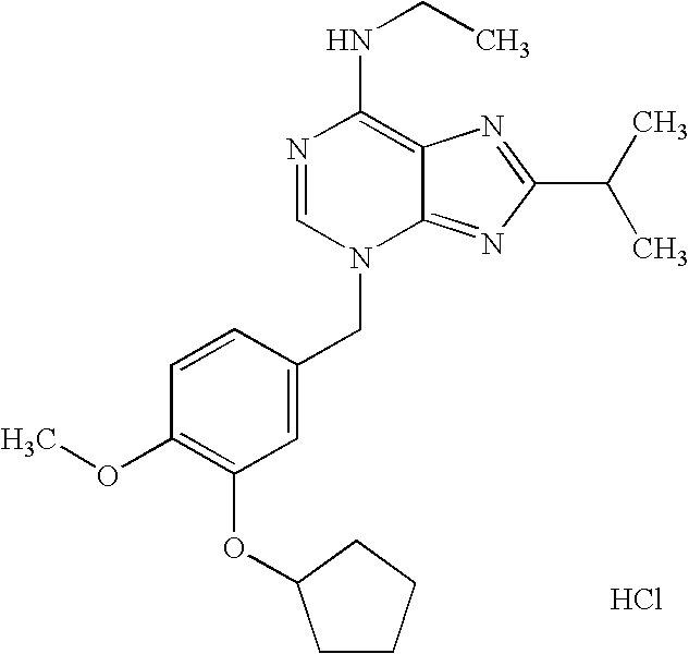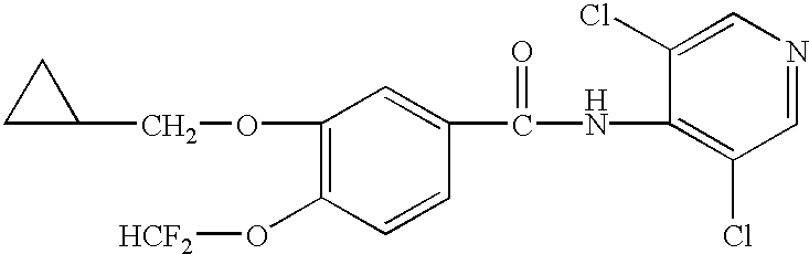 [0225] and compounds described in U.S. Pat. No. 5,712,298, Amschler, BYK Gulden Lomberg Chemische Fabrik GmbH (Konstanz, Germany), particularly the compound ROFLUMILAST (RP 73401), (benzamide 3-(cyclopropylmethoxy)-N-(3,5-dichloro-4-(difluoromethoxy)-(9Cl)), having the structure: