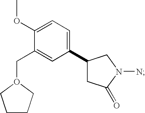 [0219] D4418; D4396; SCH351591; MESOPRAM, Chiroscience and Schering-Plough; [0220] ROLIPRAM [4-(3-cyclopentenyloxy-4-methoxyphenyl)-2-pyrrolidone], CAS [61413-54-5], Schering A G (Berlin, Germany), having the structure: