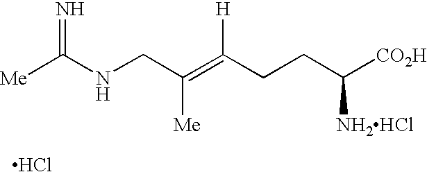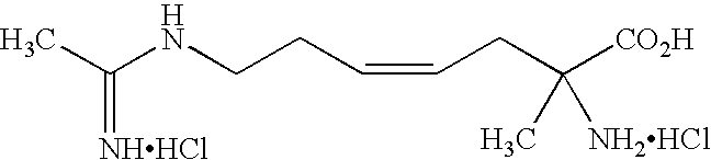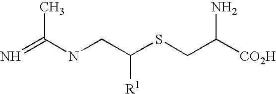[0305] EX-H-4) The product from EX-H-3 (1.0 g, 0.0023 mol) was dissolved in 5 mL of methanol. Vigorous stirring was begun and 10 mL of 40% acetic acid in water followed by zinc dust (0.5 g, 0.008 mol) was added. The stirring reaction was placed under reflux (approx. 60° C.) for 1.5 h, at which time HPLC analysis showed that most of the starting material had been consumed. The reaction was cooled and the Zn was filtered from the reaction mixture through celite, washing the celite well with additional methanol. The filtrate and methanol washings were combined and concentrated. The resulting oily-white solid was purified by reverse-phase HPLC column chromatography on a YMC ODS-AQ column eluting over 60 min pumping 100% isocratic B for 30 min followed by a gradient of 0-100% A for 10 min and a 100% A wash for 20 min (A: 100% acetonitrile, B: 100% H2O with 0.0025% acetic acid). Fractions containing product were combined and concentrated affording 0.390 g (44%) of the desired acetamidine product as a white solid. LCMS: m/z=407.3 [M+Na]. [0306] Example H) The product from EX-H-4 (0.30 g, 0.780 mmol) was dissolved in 5 mL of conc HOAc. To this was added 1 mL of 4N HCl in dioxane. The reaction was stirred 5 min. at room temperature. The solvent was removed in vacuo. The resulting solid was dissolved in water and concentrated three additional times. HPLC indicated amounts of starting material. The solid was dissolved in 1N HCl and stirred 3h at which time HPLC indicated that most of the starting material had been consumed. The solution was concentrated affording 290 mg (98%) of the desired acetamidine product as a dihydorchloride salt. LCMS: m/z=285.1 [M+H]. [0307] [0308] See Jeanguenat and Seebach, [0309] To a solution of the product of Example-I-1, (2R,4R)-Methyl-2-tert-butyl-1,3-thiazoline-3-formyl-4-carboxylate (8.65 g, 37.4 mmol), in anhydrous tetrahydrofuran (130 mL) under N2 at −78° C. was added DMPU (25 mL) and the mixture stirred for 5 min. Lithium bis(trimethylsilyl)amide, 1 M in tetrahydrofuran, (37.5 mL), was added, and the mixture stirred for 30 min. After methyl iodide (5.84 g, 41.1 mmol) was added, the mixture was held at −78° C. for 4 hr and then warmed to room temperature with continuous stirring. The solvents were evaporated in vacuo and brine and ethyl acetate was added. The aqueous phase was extracted 3× EtOAc, and the combined organic layers were washed with 10% KHSO4, water, and brine. They were then dried (anhy. MgSO4), filtered, and stripped of all solvent under reduced pressure. Chromatography of the residual oil on silica with 1-10% EtOAc/hexane yielded the title compound (5.78 g, 63%, 2.4:1 mixture of conformers).1H NMR (CDCl3) δ major conformer, 1.08 (s, 9H), 1.77 (s, 3H), 2.72 (d, 1H), 3.31 (d, 1H), 3.77 (s, 3H), 4.63 (s, 1H), 8.27 (s, 1H); minor conformer, 0.97 (s, 9H), 1.79 (s, 3H), 2.84 (d, 1H), 3.63 (d, 1H), 3.81 (s, 3H), 5.29 (s, 1H), 8.40 (s, 1H); MS m/z (electrospray) 246 (M+H)+ (100%), 188 (55) 160 (95). Retention time of 16.5 min on a Daicel Chemical Industries Chiracel OAS column, 10-40% IPA/hexane 0-25 min, >95% ee. [0310] The product of Example-1-2, (2R,4R)-Methyl-2-tert-butyl-1,3-thiazoline-3-formyl-4-methyl-4-carboxylate, (5.7 g, 23.2 mmol) was stirred with 6N HCl (100 mL) under N2 and held at vigorous reflux for 2 days. The solution was cooled, washed with EtOAc and evaporated to yield the product (2R) 2-methyl-cysteine hydrochloride (3.79 g, 95%) as a light yellow powder.1H NMR (DMSO-d6) δ1.48 (s, 3H,) 2.82 (t, 1H), 2.96 (bs, 2H), 8.48 (s, 3H). MS m/z (electrospray) 136 [M+H+]. [0311] Sodium hydride (2.6 g, 60% in mineral oil, 65 mmol) was added to an oven-dried, vacuum-cooled RB flask, containing oxygen-free 1-methyl-2-pyrrolidinone (5 mL). The mixture was cooled to −10° C. and stirred under N2. The product of Example-I-3, 2-Methyl-L-cysteine hydrochloride, (3.6 g, 21.0 mmol) dissolved in oxygen-free 1-methyl-2-pyrrolidinone (25 ml), was added in portions. After all H2 evolution ceased, 2-[(1,1-dimethylethoxycarbonyl)-amino]ethyl bromide (4.94 g, 21 mmol) in oxygen-free 1-methyl-2-pyrrolidinone (15 mL) was added at −10° C. The reaction was then stirred for 4 hr allowing warming to room temperature. The solution was neutralized with 1 N HCl and the 1-methyl-2-pyrrolidinone was removed by evaporation in vacuo. Reverse-phase chromatography with 1-20% acetonitrile in 0.05% aqueous trifluoro acetic acid solution yielded the title compound (5.9 g), recovered by freeze-drying appropriate fractions.1H NMR (DMSO-d6/D2O) δ1.31 (s, 9H), 1.39 (s, 3H), 2.55 (m, 2H), 2.78 (d, 1H), 3.04 (d, 1H), 3.06 (t, 2H). HRMS calc. for C11H22N2O4S: 279.1375 (M+H+), found 279.1379. [0312] The product of Example-I-4, S-[2-[[(1,1-dimethylethoxy)carbonyl]amino]ethyl]-2-methyl-L-cysteine trifluoroacetate, (5.5 g, 14.0 mmol) was dissolved in 1 N HCl (100 mL) and stirred at room temperature under nitrogen overnight. The solution was removed by freeze-drying to give the title S-(2-aminoethyl)-2-methyl-L-cysteine hydrochloride,1H NMR (DMSO-d6/D2O) δ1.43 (s, 3H), 2.72 (m, 2H), 2.85 (d, 1H), 2.95 (t, 2H), 3.07 (d, 1H). m/z [M+H+] 179. [0313] Example I) The product of Example-I-5, was dissolved in H2O, the pH adjusted to 10 with 1 N NaOH, and ethyl acetimidate hydrochloride (1.73 g, 14.0 mmol) was added. The reaction was stirred 15-30 min, the pH was raised to 10, and this process repeated 3 times. The pH was adjusted to 3 with HCl and the solution loaded onto a washed DOWEX 50WX4-200 column. The column was washed with H2O and 0.25 M NH4OH, followed by 0.5 M NH4OH. Fractions from the 0.5 M NH4OH wash were immediately frozen, combined and freeze-dried to give an oil that was dissolved in 1N HCl and evaporated to give the title compound as a white solid (2.7 g).1H NMR (DMSO-d6/D2O) δ1.17 (s, 3H), 2.08 (s, 3H), 2.52 (d, 1H), 2.68 (m, 2H), 2.94 (d, 1H), 3.23 (t, 2H). HRMS calc. for C8H18N3O2S: 220.1120 [M+H+], found 220.1133. [0314] [0315] The procedures and methods utilized 