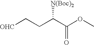 [0384] Example U-3) The product from Example U-2 (10.79 g, 28.7 mmol) was dissolved in diethyl ether (200 mL) and cooled in a dry ice bath to −80 C. To the reaction mixture Diisobutylaluminum hydride (32.0 mL, 32.0 mmol) was added and stirred 25 minutes. The reaction mixture was removed from the dry ice bath and water (7.0 mL) was added. Ethyl acetate (200 mL) was added to the reaction mixture and stirred 20 minutes. Magnesium sulfate (10 g) was added to the reaction mixture and stirred 10 minutes. The reaction mixture was filtered through celite and concentrated to give a clear yellow oil (11.19 g). The yellow oil was chromatographed on silica and eluting with ethyl acetate and hexane. The product (8.61, 87%) was a clear light yellow oil. [0385] Mass Spectrometry: M+H 346, M+Na 378 [0386] (1H)NMR (400 MHz, CDCl3) 9.74 ppm (s, 1H), 4.85 ppm (m, 1H), 3.69 ppm (s, 3H), 2.49 ppm (m, 3H), 2.08 ppm (m, 1H), 1.48 ppm (s, 18H).