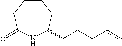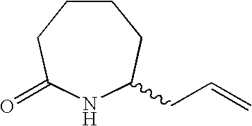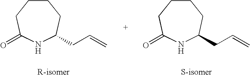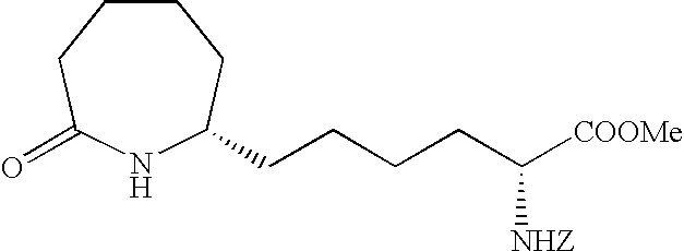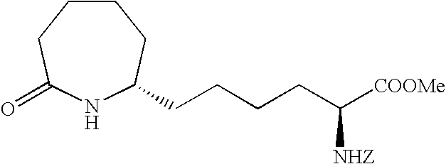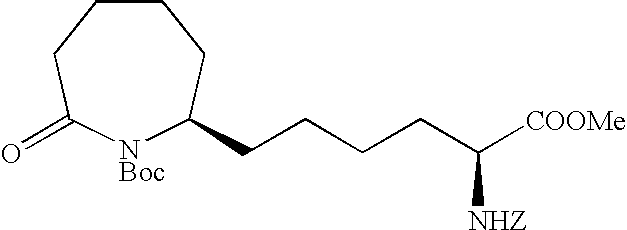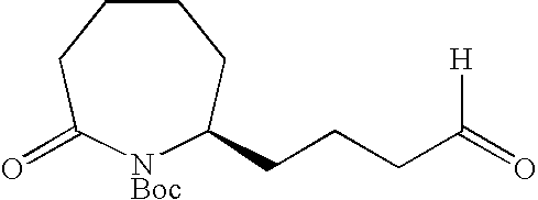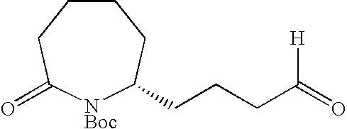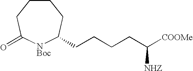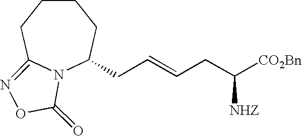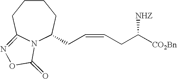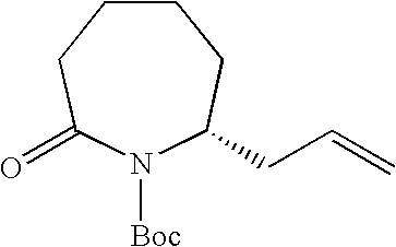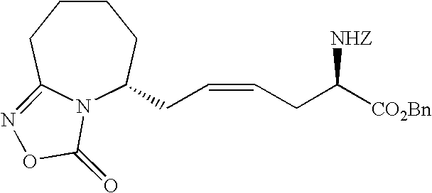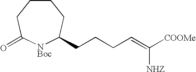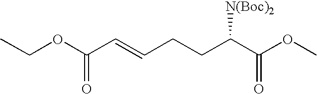 [0396] Example U-7) Product from Example U-6 (300 mg, 0.66 mmol) was dissolved in a solution of acetic acid and water (10 mL, 25/75) containing zinc metal and sonicated for 3 hours. The reaction mixture was filtered over celite and chromatographed on reverse phase HPLC to give a clear colorless residue (13 mg, 4%). [0397] (1H)NMR (400 MHz, CDCl3) 8.89 ppm (m, 1H), 5.68 ppm (m, 1H), 5.47 ppm (m, 1H), 3.80 ppm (d, 2H), 3.71 ppm (s, 3H), 2.18 ppm (m, 4H), 1.41 ppm (s, 18 H). [0398] Example U) The product from Example U-7 (13.0 mg, 0.031 mmol) was dissolved in 2 N HCl (1.22 mL, 2.44 mmol) and refluxed 1 hour. The reaction mixture was cooled, concentrated, to give a clear colorless oil (6.6 mg, 95%) [0399] Mass Spectrometry: M+H 200, [0400] (1H)NMR (400 MHz, D20) 5.65 ppm (m, 1H), 5.47 ppm (m,1H), 3.80 ppm (t, 1H), 3.72 ppm (d, 2H), 2.0 ppm (m, 5H), 1.87 ppm (m, 2H). [0401] [0402] [0403] A three neck 3L flask was purged with nitrogen before it was charged with cyclohexanone (1.27 mol, 132 mL) and 500 mL of toluene. This stirred mixture was cooled to 0° C. and 157.2 g (1.1 eq) of potassium t-butoxide was added. After stirring this mix for 1 hr, a color and texture change was noted before a solution of 5-pentenyl bromide (1.27 mol, 136 mL) in 100 mL toluene was added dropwise over 1 h to the mechanically stirred reaction mixture. The reaction mixture was allowed to warm to 25° C. and stir overnight. It was then diluted with 800 mL of 1 N KHSO4 and the organic phase was dried (MgSO4), filtered and evaporated to dryness to yield 208.5 g of crude product. This material was then purified by vacuum distillation (under water aspirator pressure) to give the title product in 47% yield. [0404]1H NMR (CDCl3, δ ppm): 1.0-2.4 (m, 13H), 4.9-5.1 (m, 2H), 5.7-5.9 (m, 1H). [0405] [0406] The product of Example V-1 (93.67 g, 0.563 mole) along with EtOH (600 mL), water (300 mL), NaOAc (101.67 g, 1.24 mole), and NH2OH.HCl (78.31 g, 1.13 mole) were combined in a three neck 3 L flask. This stirred reaction mixture was refluxed for 16 h and then stirred at 25° C. for another 24 h. All solvent was removed under reduced pressure and the residue was partitioned between diethylether (Et2O, 500 mL) and water (200 mL). The aqueous layer was extracted 3×200 mL ether. The combined organic layers were dried over MgSO4, filtered, and stripped in vacuo to give the title oxime (121.3 g, 100% crude yield). [0407]1H NMR (CDCl3, δ ppm): 1.2- 2.6 (m, 13H), 4.9-5.1 (m, 2H), 5.7-5.9 (m, 1H). [0408] [0409] A three neck 3 L flask was purged with nitrogen and then charged with hexamethydisiloxane (471.7 mL, 2.2 moles), toluene (500 mL), and phosphorous pentoxide (203.88 g, 1.4 moles). This heterogeneous mixture was refluxed until a clear solution was obtained (about 1.5 h). After cooling this mixture to room temperature, the oxime product of Example V-1 (102.1 g, 0.563 moles) in 200 mL of toluene was added to the above reaction mixture over a 1 h period at 25° C. The reaction mixture was stirred for another 4-6 h (checked by TLC: 50% EA in Hex, I2) before it was poured into ice water with thorough mixing. To this ice slurry mixture was added 250 g of NaCl and the resulting mixture was adjusted to pH 5 by adding solid potassium carbonate. This slurry was extracted with 3×500 mL of diethylether (Et2O) and the combined organic fractions were dried over MgSO4, filtered and stripped in vacuo to give the crude mixture of regioisomeric lactams (84.6 g). [0410] [0411] The product of Example V-3 was then subjected to chromatography (silica: acetonitrile) for purification and regioisomeric separation. From the crude sample, the 7-pentenyl regioisomer was isolated in 50% yield and after chiral chromatography, the desired single enantiomers were isolated in 43% yield each. [0412] R-isomer: [0413] Elemental analyses Calcd for C11H19NO: C, 71.99; H, 10.57; N, 7.63. [0414] Found: C, 71.97; H, 10.58; N, 7.52 [0415]1H NMR (CDCl3, δ ppm): 1.3-1.6 (m, 7H), 1.75-1.9 (m, 2H), 1.95-2.15 (m, 3H), 2.4-2.5 (m, 2H), 3.25-3.35 (m, 1H), 4.95-5.05 (m, 2H), 5.7-5.85 (m, 1H). [0416]13C NMR (CDCl3, δ ppm): 23.166, 25.169, 29.601, 33.209, 35.475, 35.624, 36.783, 53.600, 114.976, 137.923, 177.703 [0417] [α]25=+26.90 (CHCl3) at 365 nm. [0418] S-isomer: [0419] Elemental analyses Calcd for C11H19NO: C, 71.99; H, 10.57; N, 7.63. [0420] Found: C, 72.02; H, 10.61; N, 7.57 [0421]1H NMR (CDCl3, δ ppm): 1.3-1.6 (m, 7H), 1.75-1.9 (m, 2H), 1.95-2.15 (m, 3H), 2.4-2.5 (m, 2H), 3.25-3.35 (m, 1H), 4.95-5.05 (m, 2H), 5.7-5.85 (m, 1H). [0422]13C NMR (CDCl3, δ ppm): 23.187, 25.178, 29.630, 33.230, 35.526, 35.653, 36.778, 53.621, 115.032, 137.914, 177.703 [0423] [α]25=−25.7° (CHCl3) at 365 nm. [0424] [0425] The R-isomer product of Example V-4 (102.1 g, 0.56 mol), dry THF (800 mL), DMAP (68.9 g, 0.56 mol), Di-t-butyl dicarbonate (Boc2O, 99 g, 0.45 mol) were combined in a three neck 3L flask purged with argon. The reaction mixture was warmed to 70° C. within 30 min before an additional 52.8 g of Boc2O and 200 mL of dry THF were added. After 30 min. another 32 g of Boc2O was added and the mixture was stirred for 1 h at 70° C. Another 36 g of Boc2O was added and the mixture was stirred for 1 h. The reaction mixture was cooled to room temperature and stripped of THF at 18° C. to 20° C. under reduced pressure. A precipitate was filtered and washed with 100 mL of ethylacetate (EA) and discarded (˜45 g). The EA filtrate was diluted with 500 mL of additional EA before it was washed with 500 mL of 1N KHSO4, 500 mL of saturated aq. NaHCO3, and 500 mL of brine and then dried over anhydrous Na2SO4 for 12 h. This EA extract was then treated with 20 g of DARCO, filtered through celite topped with MgSO4, and concentrated in vacuo to give 150 g of title product as a dark brown oil. [0426]1H NMR (CDCl3, δ ppm): 1.3-1.6 (m, 4H), 1.5 (s, 9H), 1.6-1.9 (m, 6H), 1.95-2.05 (m, 2H), 2.5-2.7 (m, 2H), 4.2-4.25 (m, 1H), 4.95-5.05 (m, 2H), 5.7-5.85 (m, 1H). [0427] [0428] A three neck 3L flask co