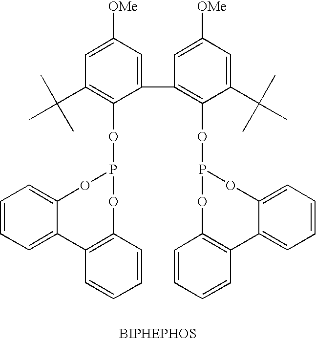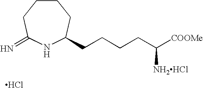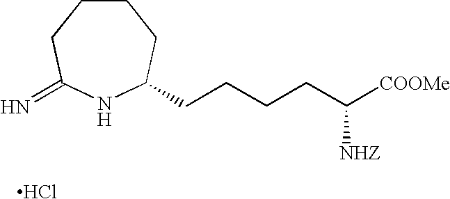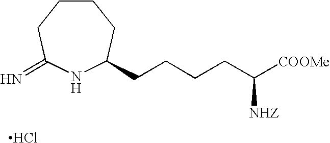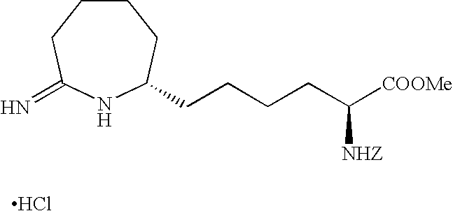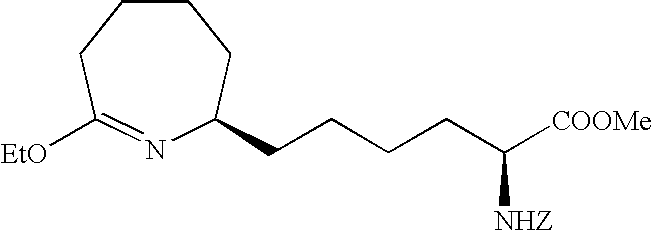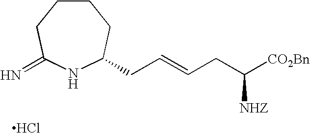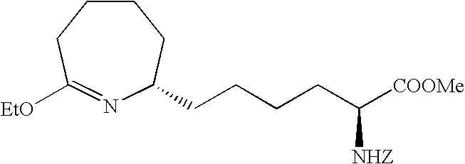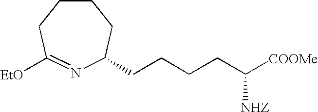 [0515] (242.9 g, 0.959 mol), and toluene (965 g). The reactor was sealed and purged 100% carbon monoxide (8×515 kPa). The reactor was pressurized to 308 kPa (30 psig) with 100% carbon monoxide and then a 1:1 CO/H2 gas mixture was added to achieve a total pressure of 515 kPa (60 psig). With vigorous mechanical agitation, the mixture was heated to 50° C. with a 1:1 CO/H2 gas mixture added so as to maintain a total pressure of about 515 kPa (60 psig). After 22 h, the mixture was cooled to about 25° C. and the pressure was carefully released. Vacuum filtration of the product mixture and evaporation of the filtrate under reduced pressure afforded a 267.7 g of a light yellow oil. Analysis by1H NMR was consistent with essentially quantitative conversion of the starting material with about 96% selectivity to the corresponding aldehyde product of Example V-6. This oil was used without further purification in the following example. [0516]1H NMR (CDCl3) δ1.47 (s, 9H), 1.6-1.80 (m, 9H), 1.84-1.92 (m, 1H), 2.41-2.58 (m, 3H), 2.61-2.71 (m, 1H), 4.2 (d, J=5.2 Hz, 1H), 9.74 (s, 1H). [0517] [0518] To a sample of N-(Benzyloxycarbonyl)-alpha-phosphonoglycine trimethyl ester (901.8 g, 2.7 mol) dissolved in CH2Cl2 and cooled to 0° C. was added a solution of DBU (597.7 g, 3.9 mol) in CH2Cl2. This clear colorless reaction mixture was stirred for 1 h at 0° C. to 6° C. before a sample of the Boc-aldehyde product Example V-6 (812.0 g, 2.9 mol) in CH2Cl2 was added drop wise at −5° C. to −1° C. The reaction, work up, and purification was completed as described in Example V-7 to give 1550 g of the title product of Example V-7 containing a small amount of CH2Cl2. [0519] To a MeOH (1 L) solution of the product of Example V-7 (100 g, 0.20 mol) was added 3 g of RR-Rh-DIPAMP catalyst. The hydrogenation was carried out at 25° C. in 1.5 h in a Parr apparatus. The reaction mixture was filtered through celite before concentrating to provide the crude Example X-9 title product as a brown oil (100 g). [0520]1H NMR (CDCl3, δ ppm): 1.35 (m, 4H), 1.5 (s, 9H), 1.6-1.9 (m, 10H), 2.5-2.8 (m, 2H), 3.75 (s, 3H), 4.25 (m, 1H), 4.45 (m, 1H), 5.1 (m, 2H), 5.65 (d, 1H), 7.35 (m, 5H). [0521] [0522] To a solution of the product of Example V-8 (100 g) in 200 mL glacial acetic acid was added 25 mL 4N HCl in dioxane. The reaction mixture was stirred at 25° C. for 20 min. before it was stripped of all solvent under reduced pressure at 40° C. to give 105 g of red brown oil. This oily product was treated with 500 mL of water and extracted 2×300 mL of dichloromethane. The combined organic layer was washed with satd. sodium bicarbonate solution (100 mL), dried over magnesium sulfate, filtered and stripped of all solvent to give 99.9 g of the title product as a red brown oil. [0523]1H NMR (CDCl3, δ ppm): 1.25-2.0 (m, 14H), 2.45 (t, 2H), 3.25 (m,1H), 3.7 (s, 3H), 4.35 (m, 1H), 5.1 (s, 2H), 5.5 (d, 1H), 6.45 (bs, 1H), 7.35 (m, 5H). ee=95% as determined by chiral HPLC. [0524] [0525] To a 30.0 g (0.077 mol) sample of the product of Example X-10 in 600 mL dichloromethane purged with argon was added 15.7 g (0.082 mol) of triethyloxonium tetrafluoroborate. This mixture was stirred for 1 h at 25° C. before 300 mL of satd. aq. sodium bicarbonate solution was added. The dichloromethane layer was separated, washed with 300 mL 50% aq. NaCl solution, dried over sodium sulfate, filtered through celite and concentrate at 25° C. to give a clear yellow oil, 31.2 g (˜97%) of the title product. [0526] Elemental analyses Calcd for C23H34N2O5: C, 60.01; H, 8.19; N, 6.69. [0527] Found for C23H34N2O5+0.5 H2O: C, 64.66; H, 8.24; N, 6.59. [0528]1H NMR (CDCl3, δ ppm): 1.2 5 (t, 3H), 1.28-1.75 (m, 12H), 1.8-1.98 (m, 2H), 2.2-2.3 (m, 1H), 2.4-2.5 (m, 1H), 3.1 (m, 1H), 3.78 (s, 3H), 3.9-4.0 (m, 2H), 4.35 (m, 1H), 5.1 (s, 2H), 5.25 (d, 1H), 7.35 (m, 5H). [0529]13C NMR (CDCl3, δ ppm): 14.27, 23.36, 25.21, 25.53, 26.09, 30.22, 32.15, 32.73, 33.90, 39.14, 52.21, 53.89, 58.04, 60.33, 66.89, 128.11, 128.35, 128.48, 136.29, 155.86, 166.30, 173.14, 177.69. [0530] IR (Neat, λ max, cm−1): 3295, 2920, 1739, 1680. [0531] UV, 257 nm, abs 0.015. [0532] [α]25=+39.8° (CHCl3) at 365 nm. [0533] [0534] To 4.2 g (0.078 mol) of ammonium chloride in 500 mL methanol was added 31.2 g of the title material of Example X-11. The reaction was refluxed at 65° C. for 5 h before all solvent was removed under reduced pressure to yield 29 g (92%) of the crude product as a foamy viscous mass. This material was purified by column chromatography to provide 23 g (70%) of the title product. [0535] Elemental analyses Calcd for C21H31N3O4.1HCl) C, 59.28; H, 7.57; N, 9.89; Cl, 8.39. Found (For C21H31N3O4+1HCl+1 H2O): C, 56.73; H, 7.74; N, 9.40; Cl, 8.06. [0536] IR (Neat, A max cm−1): 3136, 30348, 2935, 1716, 1669. [0537]1H NMR (CDCl3, δ ppm): 1.3-2.05 (m, 13H), 2.5 (t, 1H), 2.98 (m, 1H), 3.4 (bs, 1H), 3.75 (s, 3H), 4.35 (m, 1H), 5.1 (s, 2H), 5.5 (d, 1H), 7.35 (m, 5H), 8.75 (s, 1H), 9.0 (s, 1H), 9.5 (s, 1H). [0538]13C NMR (CDCl3, δ ppm): 23.25, 25.01, 25.34, 29.01, 31.88, 32.26, 33.89, 35.06, 52.33, 53.73, 56.20, 66.89, 127.95, 128.06, 128.45, 136.27, 155.93, 172.27, 172.80. [0539] UV, 257 nm, abs 0.009. [0540] Mass (ESI): M/Z, 390. [0541] [α]25=−42.80 (MeOH) at 365 nm. [0542] ee=96% as determined by chiral HPLC. [0543] The title product of Example X-12 (23 g) in 500 mL 2N HCl was refluxed for 5 h. All solvent was then removed in vacuo and the residue redissolved in water was washed with 2×300 mL of CH2Cl2. The aqueous was then concentrated in vacuo to give 17 g (100%) of the light brown hygroscopic solid title product. [0544] Elemental analyses Calcd for C12H23N3O2.2HCl: C, 45.86; H, 8.02; N, 13.37; Cl 22.56. Found for C12H23N3O2+2.1 HCl+0.7 H2O: C, 43.94; H, 8.65; N, 12.52; Cl, 22.23. [0545] IR (Neat, λ max, cm−1): 2936, 1742, 1669. [0546]1H NMR (CD3OD, δ ppm): 1.3-2.1 (m, 16H), 2.6 (dd, 1H), 2.8 (t, 1H), 3.65 (m, 1H), 4.0 (t, 1H), 7.85 (s, 1H), 8.4 (s, 1H), 8.95 (s, 1H). [05