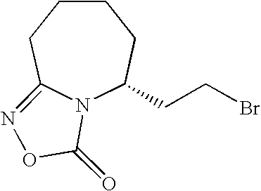 [0285] EX-E-6) To a mixture of EX-E-5, polymer-supported triphenylphosphine and 3-methyl-1,2,4-oxadiazolin-5-one in THF is added dropwise dimethylazodicarboxylate. The reaction mixture is stirred at room temperature until analysis by thin layer chromatography shows that no starting material remains. The mixture is filtered through celite, and the filtrate is concentrated. The resulting yellow oil is partitioned between methylene chloride and water. The organic layer is separated, washed with water and brine, dried over MgSO4, filtered and concentrated. The crude material is purified by flash column chromatography on silica gel to give the desired protected E-allylic amidine product.