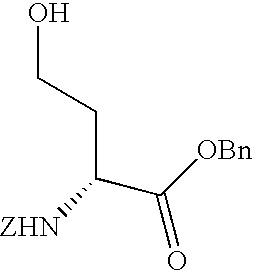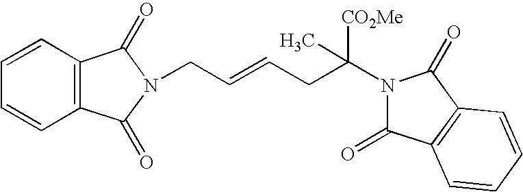 [0378] Example T-4) The product from Example T-3 was deprotected by the method of Example U-7 to afford the desired compound. [0379] Example T) The product from Example T-4 was dissolved in 2 N HCl and heated at reflux. The reaction mixture was cooled and concentrated to afford 0.12 g of the desired product. H1-NMR 1.8-2.0 (m, 2H); 2.05 (s, 3H); 2.15 (q, 2H); 3.75 (d, 2H); 3.9 (t, 1H); 5.45 (m, 1H); 5.6 (m, 1H). [0380] [0381] [0382] Example U-1) L-glutamic acid (6.0g, 40.78 mmol) was dissolved in methanol (100 mL). To the reaction mixture trimethylsilyl chloride (22.9 mL, 180 mmol) was added at 0° C. under nitrogen and allowed to stir overnight. To the reaction mixture at 0° C. under nitrogen triethylamine (37 mL, 256 mmol) and di-tert-butyldicarbonate (9.8 g, 44.9 mmol) was added and stirred two hours. The solvent was removed and the residue was triturated with ether (200 mL). The triturated mixture was filtered. The filtrate was evaporated to an oil and chromatographed on silica, eluting with ethyl acetate and hexane, to give the mono boc L-glutamic diester (10.99 g, 98%).