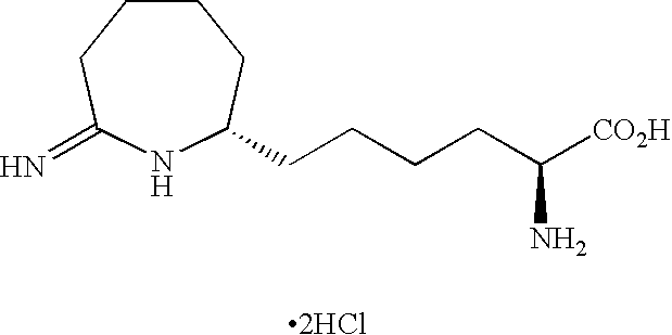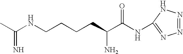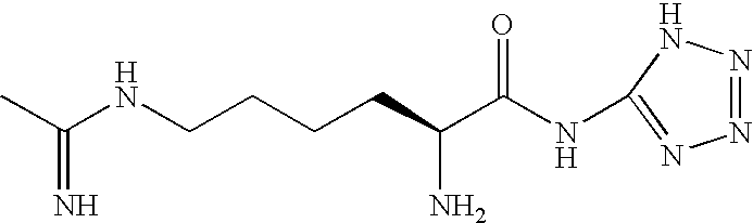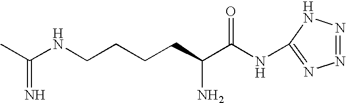 2S-amino-6-[(1-iminoethyl)amino]-N-(1H-tetrazol-5-yl) hexanamide, hydrate, dihydrochloride XI [0139] The invention also contemplates use of other selective iNOS inhibitors. By way of example, iNOS selective inhibitors also useful in the present invention are described in U.S. Pat. No. 6,355,689, Beswick et al., filed Nov. 29, 2000 and issued Mar. 12, 2002, which describes and claims a selective iNOS inhibitor with the formula XI: