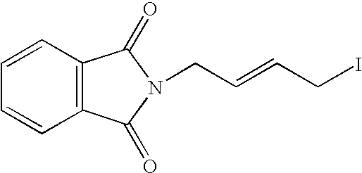 [0254] EX-B-8) To a stirring solution of the product from EX-B-7 (440 mg, 1.37 mmol) in 10 mL of DMF was added potassium phthalimide (290 mg, 1.57 mmol). The resulting mixture was heated under reflux for 18 h, at which time analysis by thin layer chromatography (30% ethyl acetate in hexane) showed that no starting material remained. The cooled mixture was diluted with 30 mL of water, extracted twice with ethyl acetate (30 mL), dried over MgSO4, filtered and concentrated to give 540 mg (91%) of the desired product as a yellow oil. LCMS: m/z=455.2 [M+Na]+. HRMS calcd. for: 433.2139 [M+H]+, found: 433.2144.1H NMR (CDCl3) δ1.4 (s, 18H), 1.6 (m, 6H), 2.05 (m, 2H), 3.6-4.42 (m, 4H), 4.9 (dt, vinyl, 1H), 5.2, (m, vinyl, 1H), 7.7 (m, 2H), 7.9 (m, 2H).19F NMR (CDCl3) δ−117.09 (m, 0.7F, J=38 Hz, 70% Z-isomer), −111.61 (m, 0.3F, J=22 Hz, 30% E-isomer).