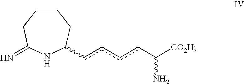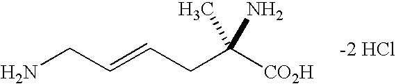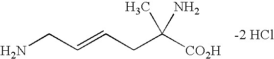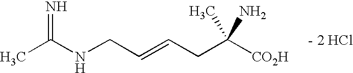[0760] Example-II-3) A slurry of the product of Example-II-2 (2.30 g, 8.01 mmol) in 0.993 M NaOH (30.0 ml, 29.79 mmol) was stirred 2 hours at room temperature. To the resulting clear colorless solution was added 1.023 M HCl (29.10 mL, 29.76 mmol). The-resulting clear solution was concentrated until a precipitate began to form (approx. 30 mL). The slurry was warmed to give a clear solution that was allowed to stand at room temperature overnight. The precipitate was isolated by filtration. The solid was washed with cold water (2×10 mL), cold methanol (2×10 mL) and Et2O (2×20 mL). The white solid was dried in vacuo at 40° C. 4 hours to give 1.04 g (53%) of the desired N-hydroxy illustrated product. mp=247.2° C. [0761] Anal. calcd. for C10H18FN3O3: C, 48.57; H, 7.34; N, 16.99; Cl, 0.0. Found: C, 48.49; H, 7.37; N, 16.91; Cl, 0.0. [0762] HRMS calcd. for C10H19FN3O3: m/z=248.1410 [M+H]+, found: 248.1390. [0763]1H NMR (D2O) δ1.35 (s, 3H), 1.81 (s, 3H), 1.7-2.0 (m, 4H), 3.87 (d, 2H) 5.29 (dt, vinyl, 1H).19F NMR (CDCl3) δ−112.51 (q, 1 F, J=21 Hz). [0764] Example-II-4) To a solution of Example-II-3 in methanol is added Lindlar catalyst. The stirred slurry is refluxed for 2 hours, then cooled to room temperature. The catalyst is removed by filtration through celite, and the filtrate is stripped. The resulting solid is dissolved in water and concentrated repeatedly from 1.0 N HCl to give the desired (2R,5E)-2-amino-2-methyl-6-fluoro-7-[(1-iminoethyl)amino]-5-heptenoic acid, dihydrochloride product.