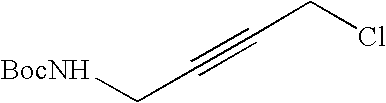 [0270] EX-D-2) The alcohol product from EX-D-1 (3.2 g, 9.0 mmol) was dissolved in 100 mL of THF and cooled in an ice bath. Carbon tetrabromide (4.27 g, 12.9 mmol) was added, and the resulting solution was stirred at 0° C. for 30 min under nitrogen. Polymer-supported PPh3 was added, and the mixture was gently stirred at 0° C. for 1 h and then overnight at room temperature. The polymer was removed by filtration through celite, and the celite pad was washed with THF. The filtrate was evaporated to give crude product, which was purified by Biotage flash column chromatography eluting with 1:3 ethyl acetate in hexane to give 2.0 g (54%, combined yield over 2 steps) of the desired bromo product as a colorless oil. HRMS calcd. for C16H28NO6Br: 410.1178 [M+H]+, found: 410.1137.1H NMR (CDCl3) δ4.9 (q, 1H), 3.7 (s, 3H), 3.4 (m, 2H), 2.2 (m, 2H), 1.9 (m, 2H), 1.5 (s, 18H).