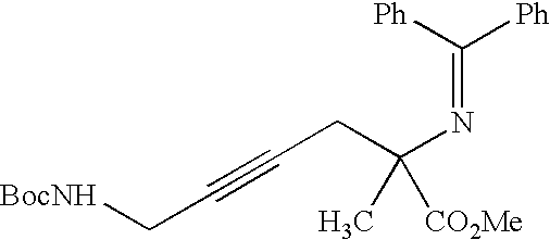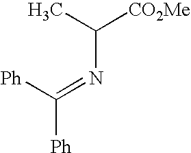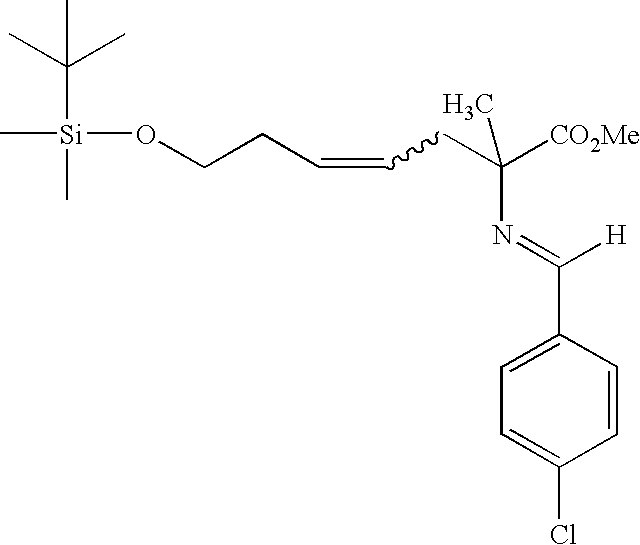 [0708] Example GG-5) A solution of N-p-chloro phenylimine alanine methyl ester (8.85 g, 34 mmol) dissolved in 59 mL of tetrahydrofuran was purged with Argon. NaH (1.64 g, 41 mmol) was added whereupon the solution turned bright orange and subsequently a deep red. A solution of the title material from Example GG-4 (8 g, 34 mmol) in 40 mL of tetrahydrofuran was added to the above anionic solution. An exotherm was observed raising the temperature to almost 40° C. The reaction mixture was maintained between 48 and −52° C. for 2 hours. It was then cooled to room temperature and filtered. Filtrate was stripped in vacuo to yield the title material (8.4 g, 50% crude yield) as a yellow oil. [0709]1H NMR (CDCl3) δ: 0.02 (s, 6H), 0.085 (s, 9H), 1.45 (s, 3H), 1.6 (s, 1H), 2.2-2.25(m, 2H), 2.65 (d, 2H), 3.55 (m, 2H), 3.7 (s, 3H), 5.45-5.55 (m, 2H), 7.35-7.7 (m, 4H)