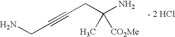 [0265] EX-C-4) The product from EX-C-3 (88 mg, 0.19 mmol) was dissolved in 4 mL of 25% acetic acid in water containing a few drops of methanol, and then Zn dust (109 mg, 1.67 mmol) was added. The mixture was agitated under sonication for 3 h. The Zn was filtered off through a celite pad, and the pad was washed with water. The filtrate was evaporated to dryness to give crude product which was purified by reverse-phase HPLC column chromatography on a YMC Combiprep column eluting over 8 min with a gradient of 20-80% A (A: 100% ACN with 0.01% TFA, B: 100% H2O with 0.01% TFA). The desired product was collected in two fractions, and the combined fractions were concentrated. The product was obtained as a colorless oil as a mixture of trifluoroacetate salts that contained only the desired Z-isomer by19F NMR: 30% was mono Boc-protected product: HRMS calcd. for C15H26N3O4F: 332.1986 [M+H]+, found 332.2001, and 70% was di-Boc-protected product: HRMS calcd. for C20H34N3O6F: 432.2510 [M+H]+, found 432.2503.1H NMR of the di-Boc product (D2O) δ1.3 (s, 18H), 1.8 (m, 1H), 2.1 (m, 3H), 2.1 (s, 3H), 3.6 (s, 3H), 3.9 (d, 2H), 4.9 (dt, vinyl, 1H, J=37 Hz).19F NMR (D2O) δ−117.3 (dt, 1F, J=37 Hz). [0266] Example C) The combined mono- and di-BOC products from EX-C-4 were dissolved in 30 mL of 6N HCl, and the solution was refluxed for 4 h, at which time LCMS analysis indicated complete reaction. The excess HCl and water was removed in vacuo. Upon completion, 9 mg (40% combined yield for two steps) of the desired (2S,5Z)-2-amino-6-fluoro-7-[(1-iminoethyl)amino]-5-heptenoic acid, dihydrochloride product was obtained as a light yellow, very hygroscopic foam, that contained only the desired Z-isomer by19F NMR. HRMS calcd. for C9H16N3O2F: 218.1305 [M+H]+, found 218.1320.1H NMR (D2O) δ1.3 (s, 18H), 1.9 (m, 2H), 2.1 (m, 2H), 2.1 (s, 3H), 3.8 (t, 1H), 3.9 (d, 2H), 4.9 (dt, vinyl, 1H, J=37 Hz).19F NMR (D2O) δ−117.3 (dt, 1F, J=37 Hz). [0267] [0268] [0269] EX-D-1) The product from EX-D-2 (3.75 g, 10 mmol) was dissolved in 60 mL of methanol, and solid NaBH4 (4 g, 106 mmol) was added in portions at room temperature over 10 h, at which time HPLC analysis indicated approximately 84% reduction. The reaction mixture was quenched with sat. NH4Cl, and was then extracted with ethyl acetate three times. The combined organic layers were dried over MgSO4, filtered, and evaporated to give 3.2 g of crude product as a yellow oil. HRMS calcd. for C16H29NO7: 348.2022 [M+H]+, found: 348.2034.1H NMR (CD3OD) δ4.9 (q, 1H), 3.7 (s, 3H), 3.5 (t, 2H), 3.2 (m, 1H), 2.1 (m, 1H), 1.9 (m, 2H), 1.5 (s, 18H).