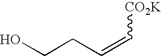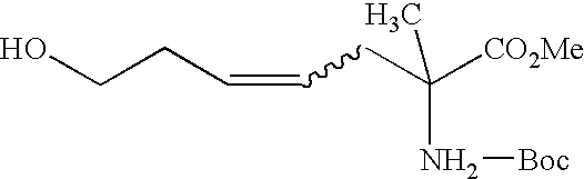 [0263] EX-C-2) The ester product from EX-C-1 (3.5 g, 8.1 mmol) was dissolved in 80 mL of methanol at room temperature, solid NaBH4 (3 g, 80 mmol) was then added in portions. The mixture was stirred at room temperature for 18 h, at which time HPLC analysis indicated that the reaction was >90% complete. The reaction was quenched with sat NH4Cl. The product was extracted with ethyl acetate and dried over Na2SO4. The organic layer was evaporated to give 3.2 g of crude product as a colorless oil, which was purified by Biotage flash column chromatography eluting with 20%-30% ethyl acetate in hexane to give 2.11 g (67%) of a Z/E mixture of the fluoro olefin product as a clear oil along with 0.41 g (13%) of the desired pure (Z:E=97:3 by19F NMR) Z-isomer product as a clear oil. HRMS calcd. for C18H30NO7F: 414.1904 [M+Na]+, found 414.1911.1H NMR (CDCl3) δ1.48 (s, 18H), 2.0 (m, 1H), 2.2 (m, 3H), 3.7 (s, 3H), 4.1 (dd, 2H, J=17Hz), 4.8 (dt, 1H, J=39 Hz), 4.9 (m, 1H).19F NMR (CDCl3) δ−119.1 (dt, 1F, J=39 Hz, J=17 Hz).