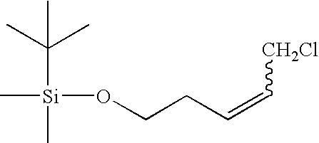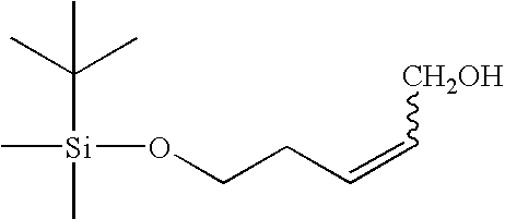 [0704] Example GG-3) The material from Example GG-2 was dissolved in 25 mL of toluene and cooled to 0° C. Diisobutylaluminum hydride (1.0 M in toluene, 32 mL, 48 mmol) was added dropwise maintaining the temperature between 5 and −10° C. The reaction mixture was stirred for 1.5 hours between 6 and −8° C. before it was cooled to −25° C. To this mixture was added 100 mL of 0.5N sodium potassium tartarate. The reaction mixture was allowed to warm up to room temperature and stirr for an hour. A gelatinous precipitate was formed which was filtered. The aqueous was extracted with 2×100 mL EtOAc. The combined organic layers were dried (sodium sulfate), filtered and concentrated in vacuo to yield title product (3.45 g, 66%) as a colorless oil. [0705]1H NMR (CDCl3) δ: 0.02 (s, 6H), 0.085 (s, 9H), 2.25-2.32 (m, 2H), 2.6 (bs, 1H), 3.6 (t, 2H), 4.08 (d, 2H), 5.45-5.55 (m, 1H), 5.7-5.75 (m, 1H)